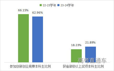 2023—2024学年,学院共有81名教师参与学生创新创业教育工作,投入创新创业专项资金62.12万元、奖学金17万元。本科生参加大学生创新创业训练项目45项,其中国家级大学生创新创业训练项目3项,省级大学生创新创业训练项目12项,校级创新创业训练项目30项,总共参与学生158人,占在校本科生人数的9.1%。参加创新创业竞赛本科生1093人,占在校本科生人数的62.96%,在创新创业竞赛中获省部级以上奖项的本科生380人,占在校本科生人数的21.89%。近两学年参加创新创业竞赛及获省部级以上奖项的本科生占比见图7。