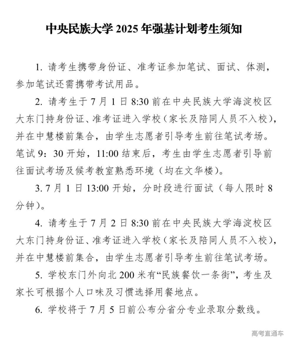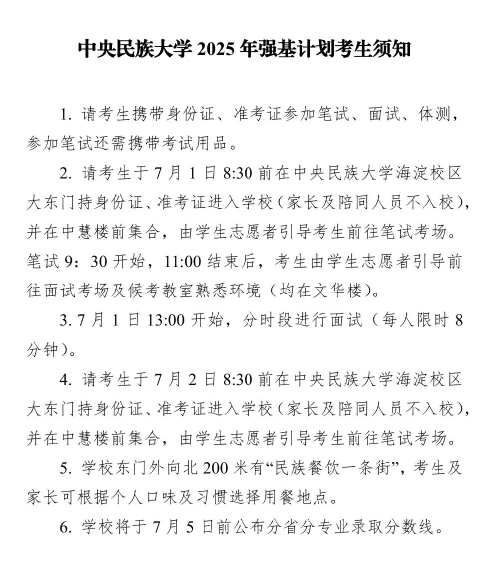 二、校测安排 我校今年安排在海淀校区举行强基计划校考(笔试、面试及体测)。具体安排为:7月1日上午9:30举行笔试(考试时间1个半小时),下午13:00开始分批安排单人面试(每名考生面试时间控制在8分钟左右);7月2日上午9:00进行体测。 中央民族大学招生办公室 2025年6月27日