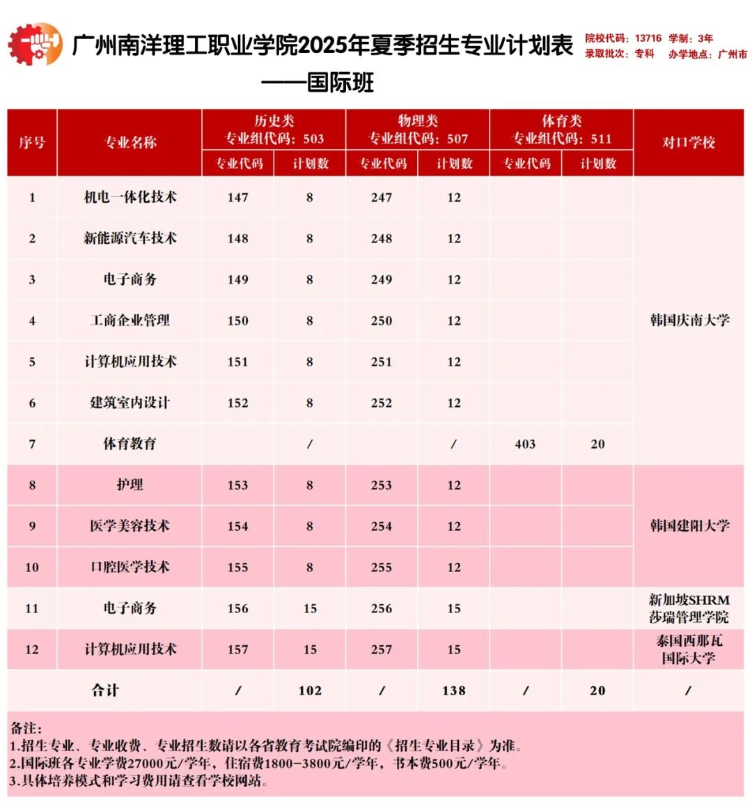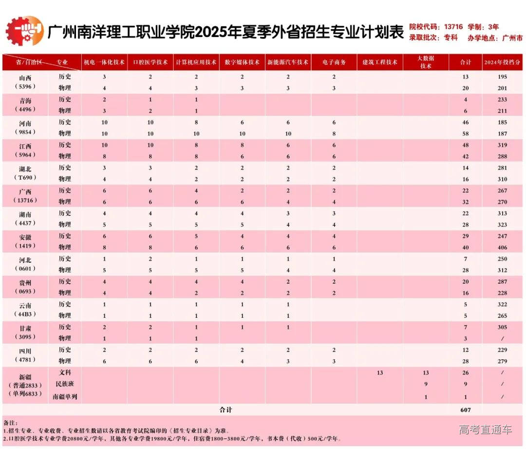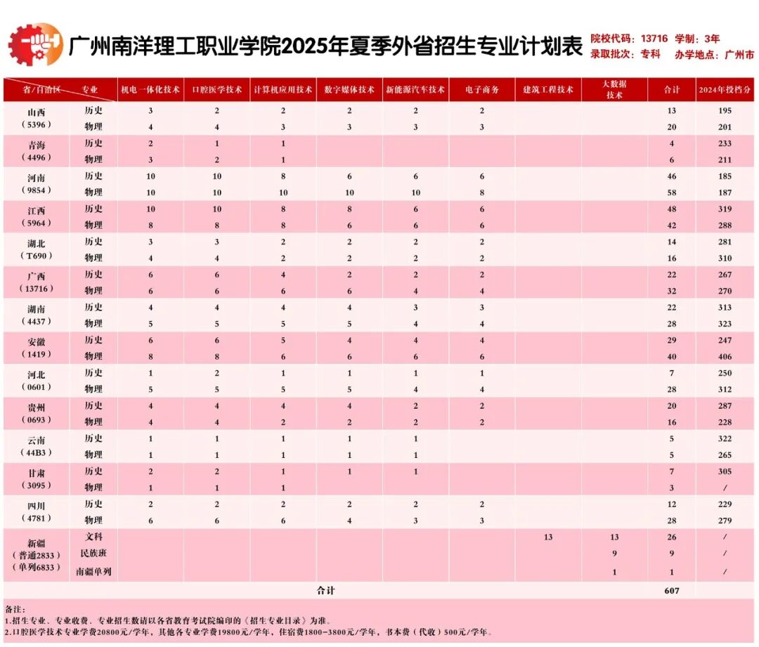 广州南洋理工职业学院面向广东、山西、青海、河南、江西、湖北、广西、湖南、安徽、河北、贵州、云南、甘肃、四川、新疆15个省/自治区招生。其中广东省招生计划数3774人,外省招生计划数607人。