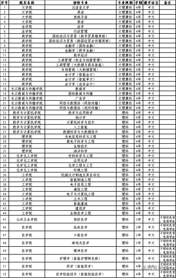 说明:1. 招生专业若有变化,以夏季普通高考招生专业目录为准;2. 医学类等专业不招收色盲、色弱学生,其他专业招收学生对身体健康体检要求和标准按照有关规定执行。