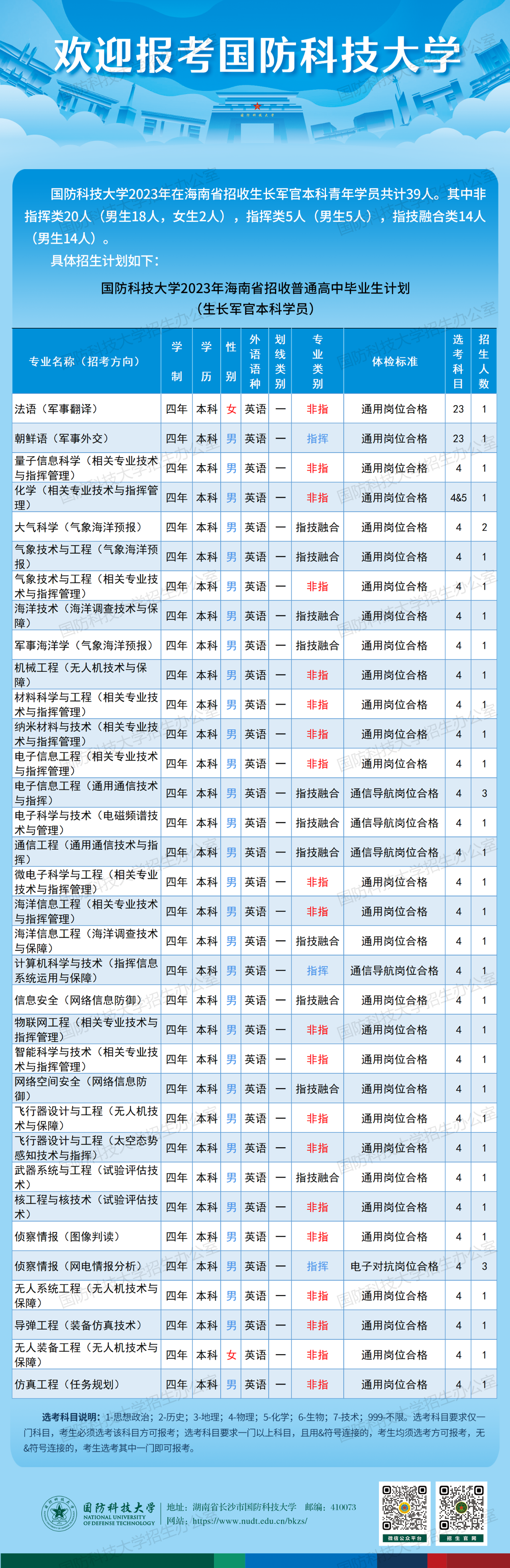 国防科技大学2023年生长军官本科学员招生计划(海南)
