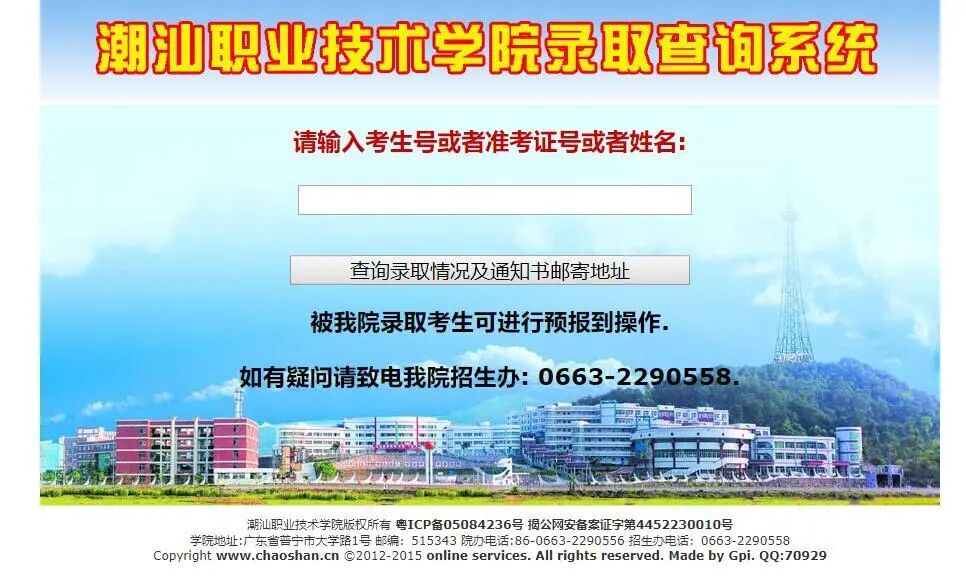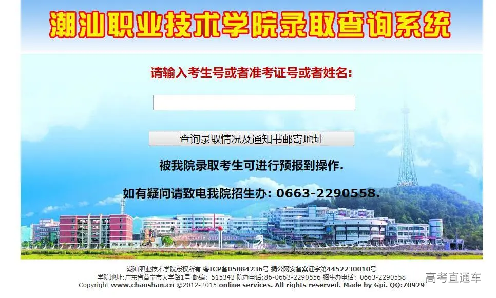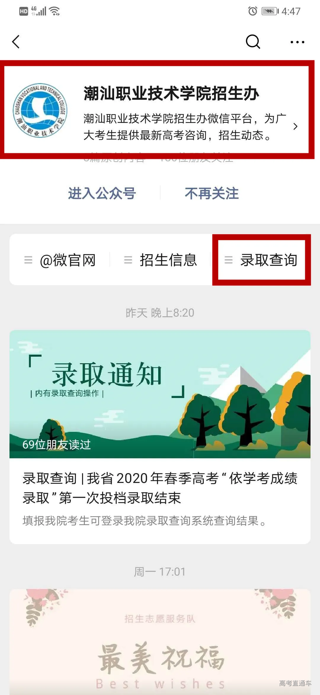1、关注潮汕职业技术学院招生办公众微信,在页面底部选择“录取查询”栏;或复制查询系统网址:http://mis.chaoshan.cn/cxbdsys/index.html ,到浏览器进行录取查询。