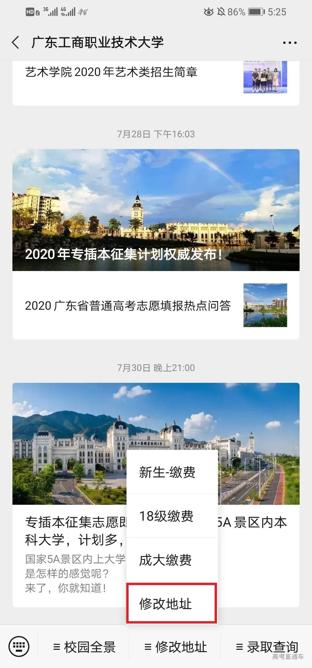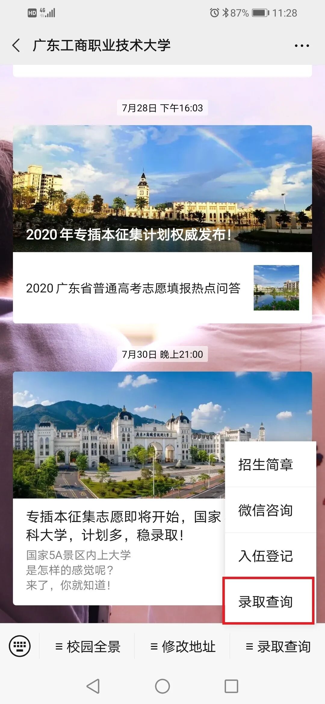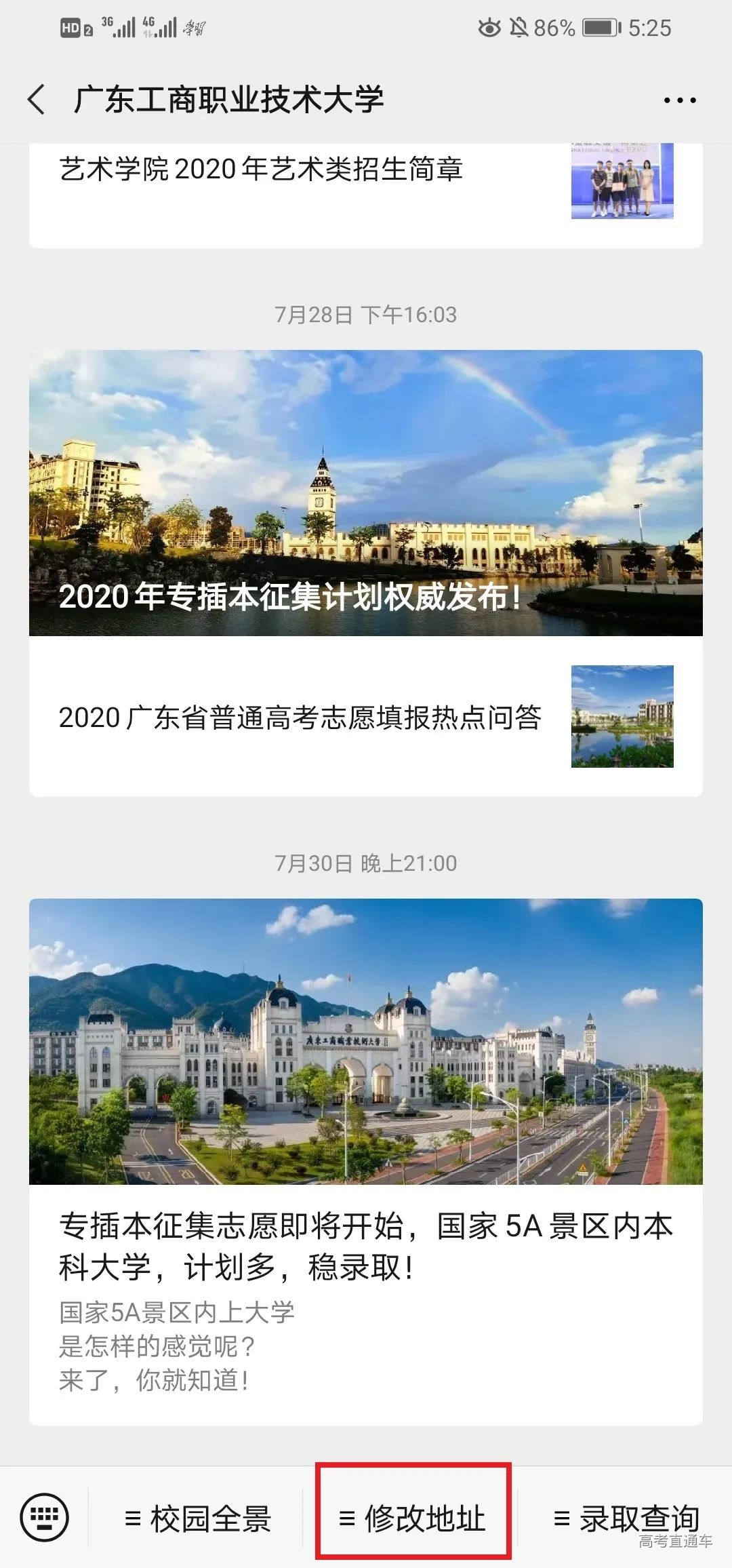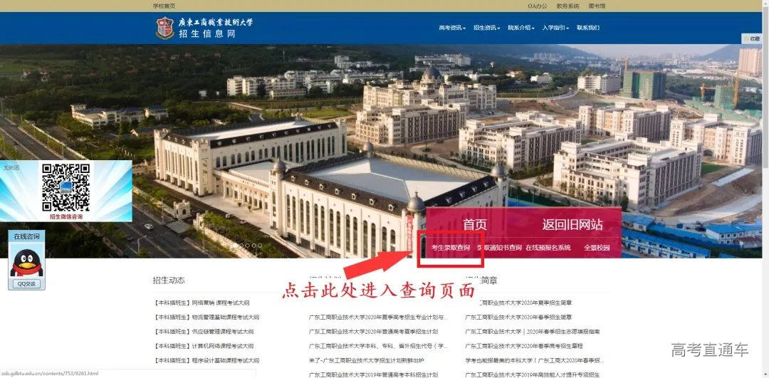 本科美术类录取情况 我校2020年广东省美术类首次招生,招生专业为环境艺术设计,招生计划100人。从录取情况来看,我校美术类最高录取分为477分(综合分),最低投档分为445分(综合分),最低排位20982,超出省美术类本科最低录取分数线36分。最低分数:445分,最低排位:20982 本科美术类录取查询 一、学校公众号查询 打开我校微信公众号点击录取查询 第1步 第2步 第3步 二、学校招生信息网查询 打开我校官网:www.gdbtu.edu.cn 第2步 第3步 第4步 三、省考试院公众号查询 考生可关注“广东省教育考试院”微信公众号,在下方菜单栏里选择“小程序”,进入省考试院的微信小程序,通过输入考生的考生号和登录密码即可进行录取查询。 录取通知书修改地址 第一步:打开微信公众号点击修改地址 第二步:填写相关信息并提交 2020年,走进最美工商大学 与你一起度过美好四季 立足现在,展望未来 未来,属于我们追梦人 我们的故事,待你开启
