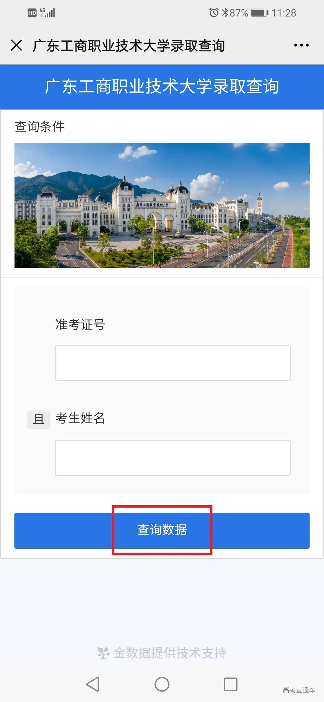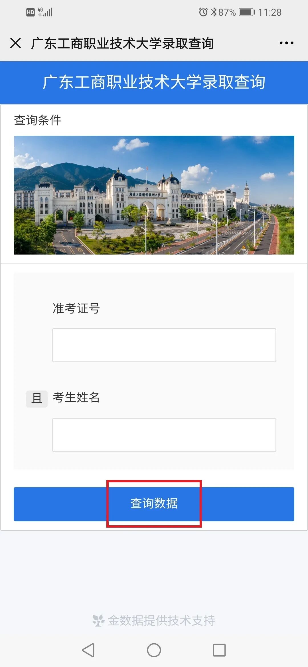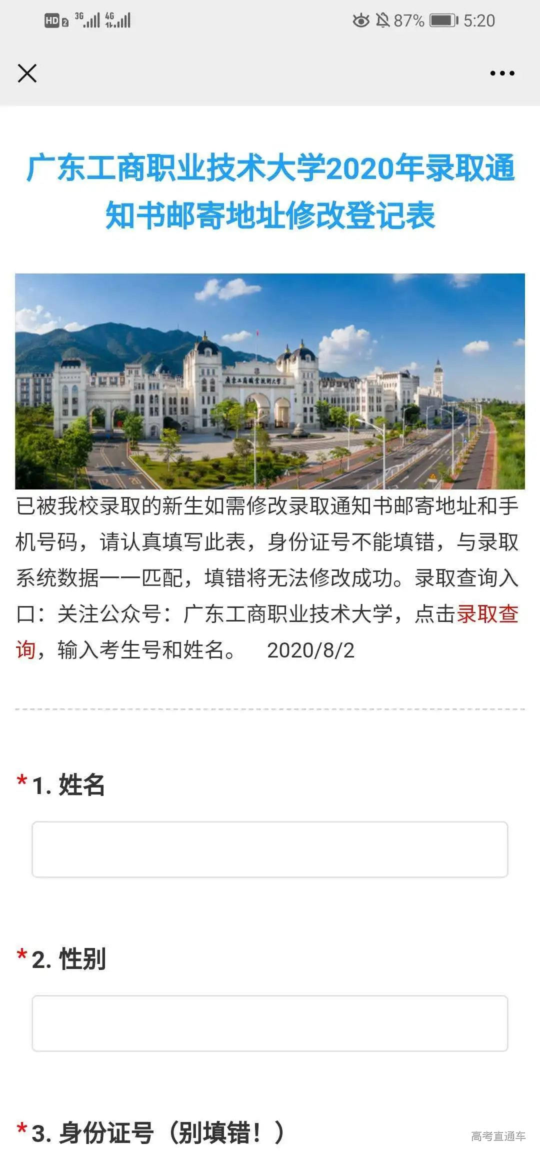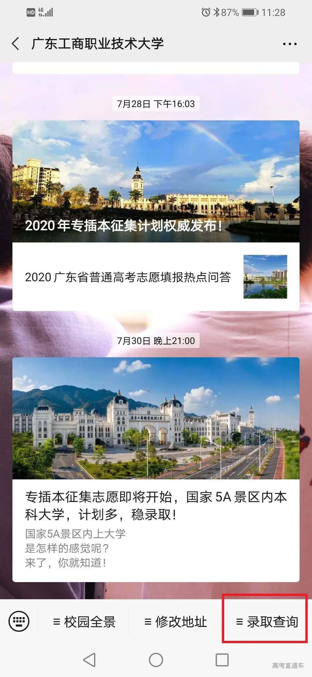 本科美术类录取情况 我校2020年广东省美术类首次招生,招生专业为环境艺术设计,招生计划100人。从录取情况来看,我校美术类最高录取分为477分(综合分),最低投档分为445分(综合分),最低排位20982,超出省美术类本科最低录取分数线36分。最低分数:445分,最低排位:20982 本科美术类录取查询 一、学校公众号查询 打开我校微信公众号点击录取查询 第1步 第2步 第3步 二、学校招生信息网查询 打开我校官网:www.gdbtu.edu.cn 第2步 第3步 第4步 三、省考试院公众号查询 考生可关注“广东省教育考试院”微信公众号,在下方菜单栏里选择“小程序”,进入省考试院的微信小程序,通过输入考生的考生号和登录密码即可进行录取查询。 录取通知书修改地址 第一步:打开微信公众号点击修改地址 第二步:填写相关信息并提交 2020年,走进最美工商大学 与你一起度过美好四季 立足现在,展望未来 未来,属于我们追梦人 我们的故事,待你开启