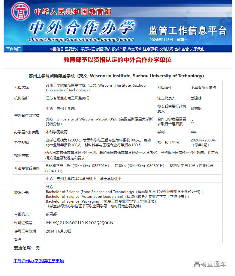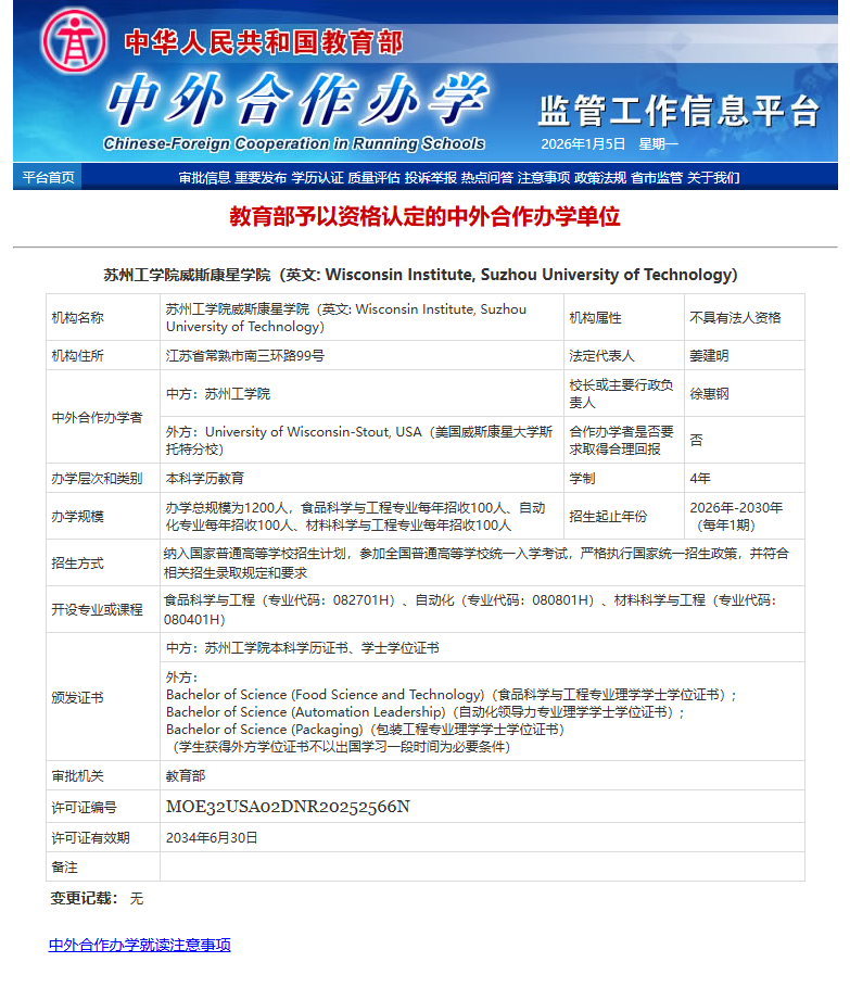 多年来,学校始终坚持开放办学,形成了以中美产教融合为特色的新工科应用型人才培养新路径。2018年,学校与威斯康星大学斯托特分校建立合作关系,开展江苏省中美学分互认联合培养项目(双学位),在中美协同育人、教师双向交流、中美联合科研、国际产学研用、美方师生来华交流等方面开展全方位合作。近年来,中美联合培养双学位毕业生70%以上就读全球排名前200硕士或博士;学校中美学分互认联合培养项目食品质量与安全专业获批江苏“十四五”高校国际化人才培养品牌专业立项资助,“深化中美省州大学融合发展的实践”入选江苏高校对外合作与交流典型案例,中美智能制造主题工作坊、中国文化主题工作坊获教育部“美国青年使者交流学习计划”重点推介,学校获评中国教育国际交流协会《中美人才培养计划》121项目创新人才培养实验基地,连续多年获评《中美人才培养计划》121项目年度先进单位,荣获《中美人才培养计划》121项目25周年“突出贡献奖”和“特别创新奖”。 威斯康星大学斯托特分校成立于1891年,是美国威斯康星州的公立综合性大学,2001年获得美国波多里奇国家级质量大奖(美国国家教育质量的最高级别奖项),是美国第一所获此殊荣的高校。该校以培养理工科类人才为重点,以应用研究、企业合作、对接产业为特色。该校的食品科学与工程专业获得了IFT国际认证(国际食品科技界最具权威性的学术组织),自动化领导力专业是全美国第一个跨学科培养自动化领导人才的本科专业,包装工程专业在全美包装专业排名第三。 苏工威斯康星学院引进威斯康星大学斯托特分校具有国际一流专业水平的食品科学与工程、自动化及材料科学与工程(包装工程)的工程教育理念和跨学科融合资源,为苏州、江苏乃至长三角区域产业发展培养具备生命健康创新生产能力、自动化工程研发能力、绿色包装创新实践能力的新工科应用型人才。首批设置食品科学与工程、自动化、材料科学与工程三个本科专业,项目由双方联合制定人才培养方案并共同实施,计划于2026年开始招生,每年招生规模300人(每专业100人)。该项目纳入国家普通高等学校招生计划,面向全国统一招生,学制四年,实行“4+0”培养模式。学生全程在苏州工学院完成学业,注册中外双学籍,学生修满规定学分、达到培养要求后,可获得苏州工学院本科毕业证书和学士学位证书,同时获得威斯康星大学斯托特分校授予的理学学士学位。 学校将以苏工威斯康星学院为契机,积极引进国外优质教育资源和先进办学理念,创新教育管理机制,积极探索党建引领下的国际化新工科应用型人才培养新模式,发挥示范、辐射、引领作用,推进教育教学综合改革,全面提升国际化人才培养质量。以“立德树人”为根本任务,采用“融通中外、产业导向、服务社会”的合作办学模式,培养具有全球视野、通晓国际规则、具备创新创业能力、跨文化交流能力、工程实践能力的新时代创新型新工科应用型人才。 2026年 苏工威斯康星学院正式开始招生 三个本科专业 中美双学位 等你来加入