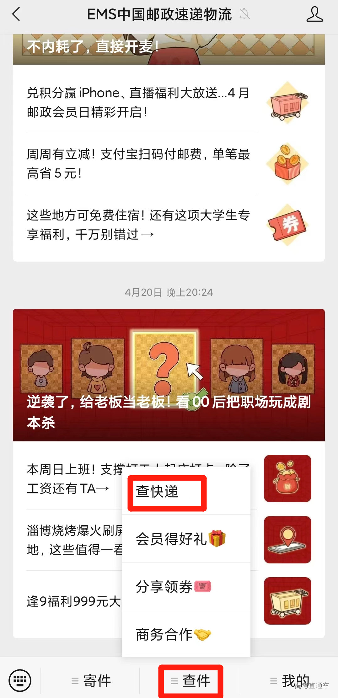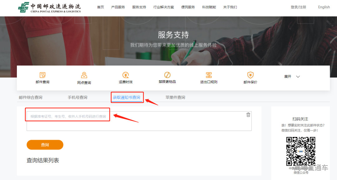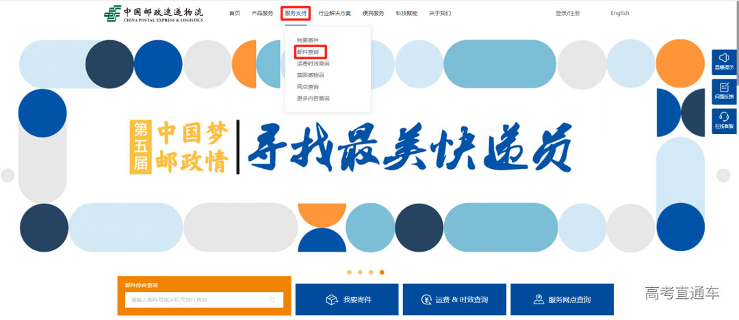 1.网页搜索“中国邮政速递物流”或者输入网址:https://www.ems.com.cn/,进入首页,选择“服务支持”—“邮件查询”。