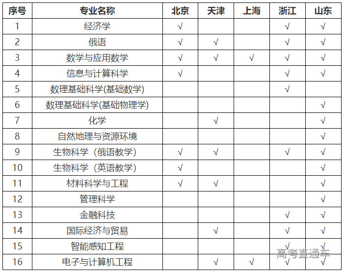 在北京、天津、上海、浙江、山东各省(直辖市)计划招生专业如下,表中“√”表示该省份有此招生专业。
