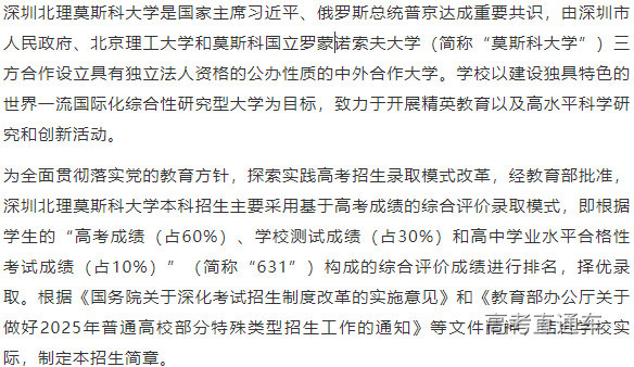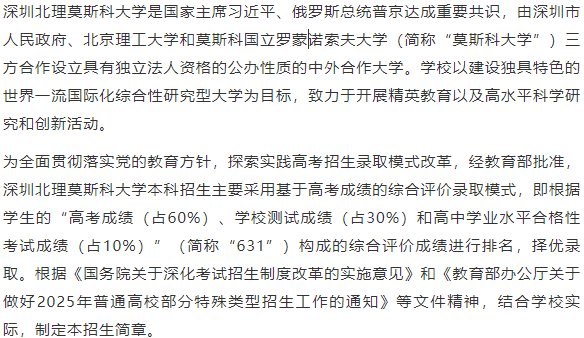 考生高考成绩须达到生源省份公布的特殊类型招生录取控制分数线及以上,参加学校测试且成绩合格,方可在高考志愿提前批次或综合评价试点高校相应批次(以省份招生考试机构发布的文件为准)填报深圳北理莫斯科大学。填报专业志愿时,学校测试科目不同的专业不可同时填报。