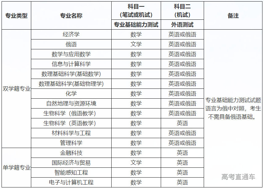 2.“生物科学(英语教学)”、“金融科技”、“国际经济与贸易”、“智能感知工程”及“电子与计算机工程”专业学校外语测试(科目二)为英语,非英语语种考生请慎重报考。