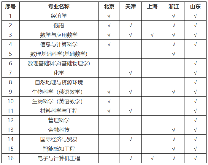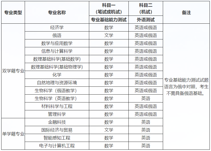 2.双学籍专业的主要教学语言为俄语,其中“生物科学(英语教学)”专业的主要教学语言为英语;单学籍中“国际经济与贸易”、“金融科技”专业主要教学语言为英语,其他专业的教学语言为汉语、英语。