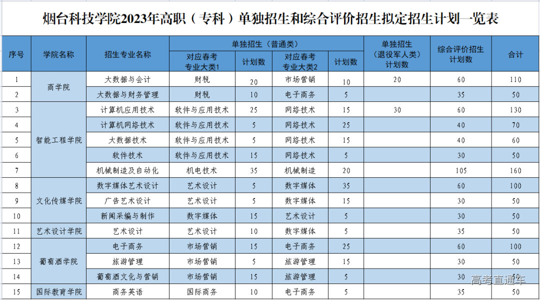 第十一条 烟台科技学院2023年高职(专科)单独招生和综合评价招生计划数:高职(专科)单独考试招生(普通类)400、高职(专科)单独考试招生(退役士兵类)50、高职(专科)综合评价招生680,共计1130。招生计划最终以省教育厅下达的为准。