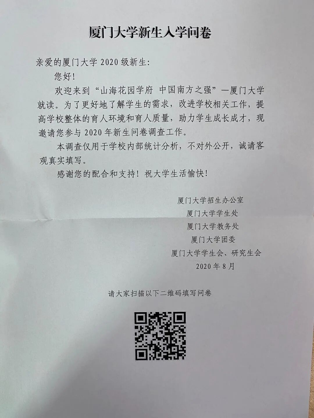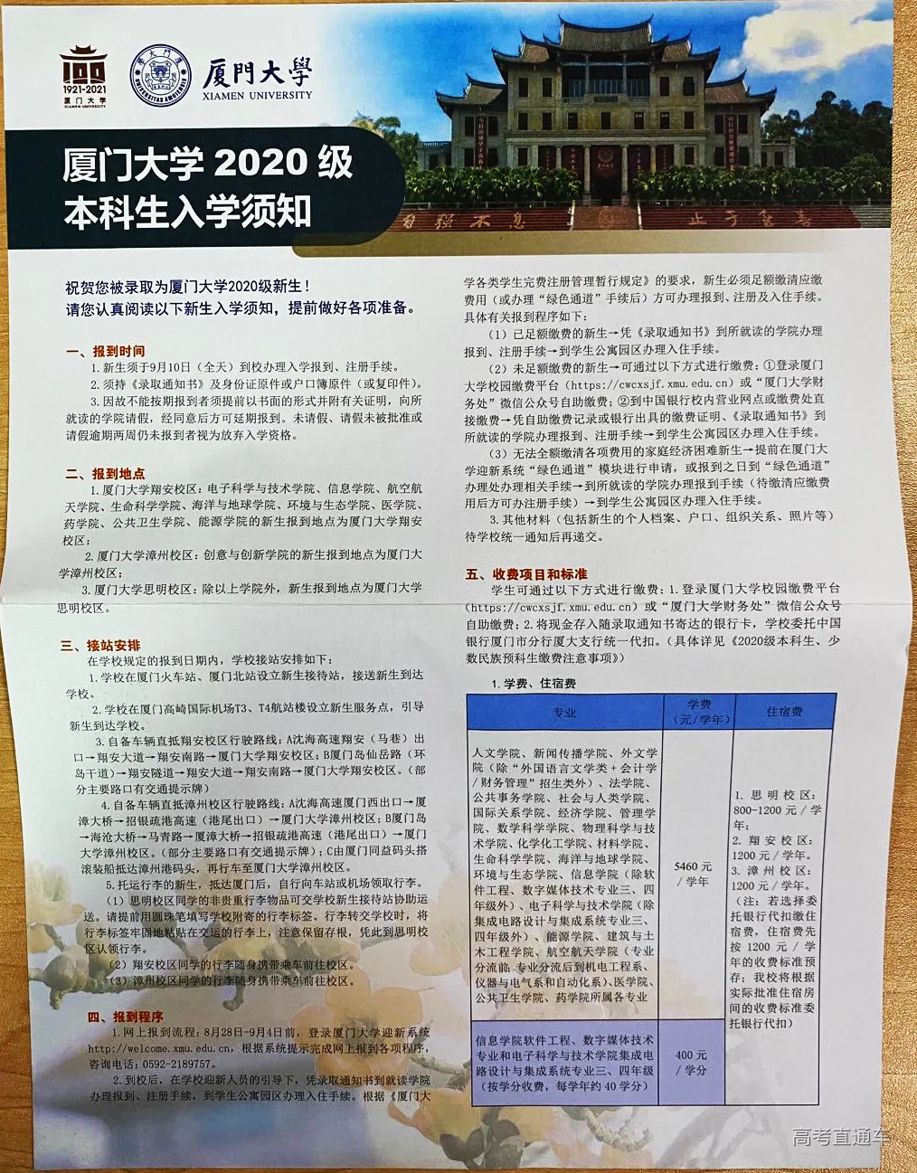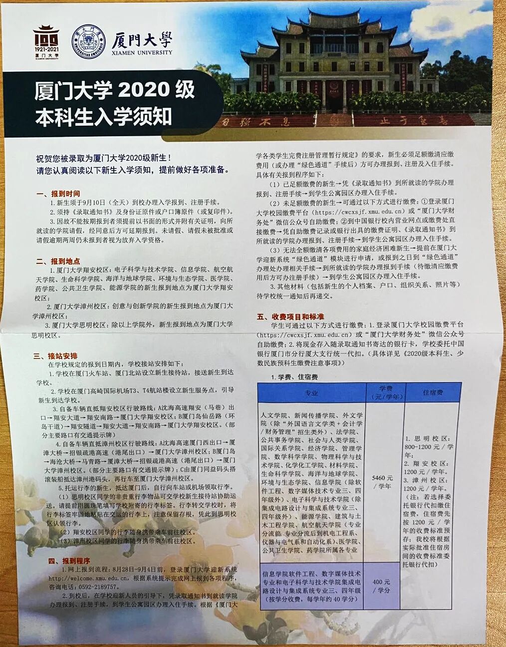 录取通知书 这则录取通知书 承载了你即将开启的厦大生活 — — 源于学生设计 倾注爱与崇敬 愿你学业红红火火的“红” 厦大标志“嘉庚主楼群” 金边结合点线面 展现最美校园风采 注册联 校训联 珍藏联 一则用于报到 两则用心收藏 海浪 校徽 白鹭 温馨祝福 这是人文与科学的殿堂 自强不息 止于至善 是期待 也是祝愿 厦大百年校庆倒计时300天首日封 春秋代序 百年辉煌 2021年4月6日 厦门大学将迎来100年华诞 这是厦门大学历史发展的里程碑 继往开来的新起点 在100周年校庆倒计时300天的仪式上 厦大党委书记张彦、校长张荣发出 《厦门大学致高考学子相约百年邀请函》 百年等一回,厦大邀你来 即将进入厦大的2020级的你 将有一个与众不同的经历 你的人生能与一所百年学府 同步开启青春的新起点 这是多么的美好而幸运 厦大手绘地图 食堂 宿舍 教学楼 上弦 爱秋 芙蓉湖 ··· 带上它一起去探索厦大吧 新生入学须知 入学第一课 报到时间 报到地点 报到程序 收费项目和标准 学校接站安排 户口 组织 档案 ··· 重点信息要记下来哦 银行卡 少带现金 多安全 行李标签 行李代运 轻松入校 致家庭经济困难新生的一封信 做你最坚强的后盾 绿色通道 网络防骗警示 仔细阅读 不给骗子留机会 易班宣传单 易班 你的好帮手 大学英语分级考试注意事项 征兵宣传 做最可爱的人 新生入学问卷 扫码填一填 亲爱的同学,海阔凭鱼跃,天高任鸟飞,百年厦大,以他海阔天空的情怀和“善待学生”的传统,等待着你的到来,成就你的美好人生! 我爱你 九月见 在凤凰花开的季节相见