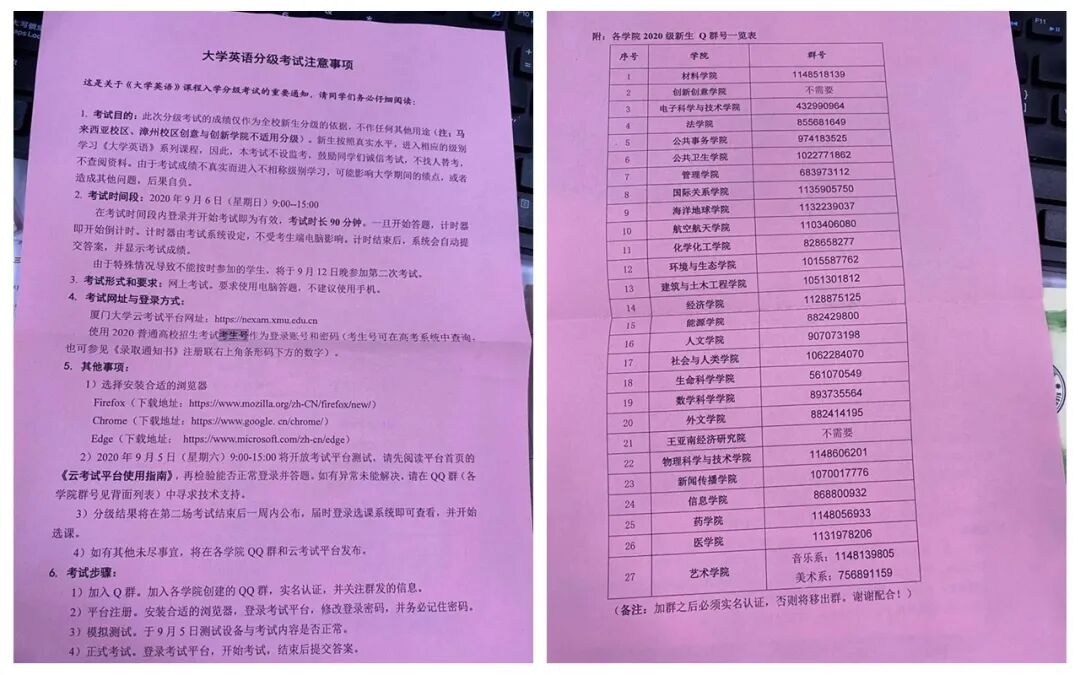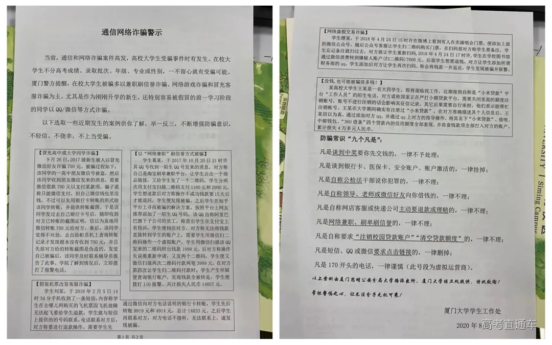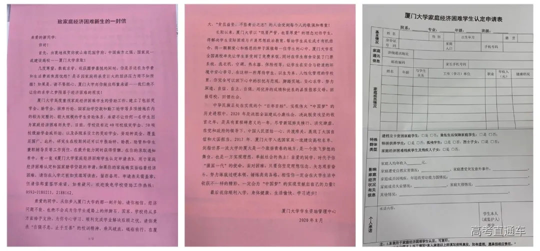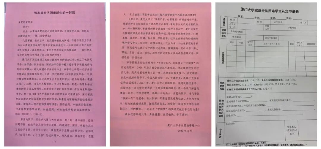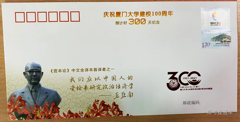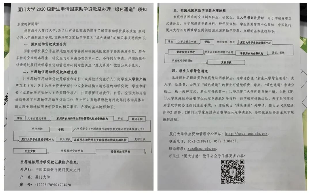 录取通知书 这则录取通知书 承载了你即将开启的厦大生活 — — 源于学生设计 倾注爱与崇敬 愿你学业红红火火的“红” 厦大标志“嘉庚主楼群” 金边结合点线面 展现最美校园风采 注册联 校训联 珍藏联 一则用于报到 两则用心收藏 海浪 校徽 白鹭 温馨祝福 这是人文与科学的殿堂 自强不息 止于至善 是期待 也是祝愿 厦大百年校庆倒计时300天首日封 春秋代序 百年辉煌 2021年4月6日 厦门大学将迎来100年华诞 这是厦门大学历史发展的里程碑 继往开来的新起点 在100周年校庆倒计时300天的仪式上 厦大党委书记张彦、校长张荣发出 《厦门大学致高考学子相约百年邀请函》 百年等一回,厦大邀你来 即将进入厦大的2020级的你 将有一个与众不同的经历 你的人生能与一所百年学府 同步开启青春的新起点 这是多么的美好而幸运 厦大手绘地图 食堂 宿舍 教学楼 上弦 爱秋 芙蓉湖 ··· 带上它一起去探索厦大吧 新生入学须知 入学第一课 报到时间 报到地点 报到程序 收费项目和标准 学校接站安排 户口 组织 档案 ··· 重点信息要记下来哦 银行卡 少带现金 多安全 行李标签 行李代运 轻松入校 致家庭经济困难新生的一封信 做你最坚强的后盾 绿色通道 网络防骗警示 仔细阅读 不给骗子留机会 易班宣传单 易班 你的好帮手 大学英语分级考试注意事项 征兵宣传 做最可爱的人 新生入学问卷 扫码填一填 亲爱的同学,海阔凭鱼跃,天高任鸟飞,百年厦大,以他海阔天空的情怀和“善待学生”的传统,等待着你的到来,成就你的美好人生! 我爱你 九月见 在凤凰花开的季节相见