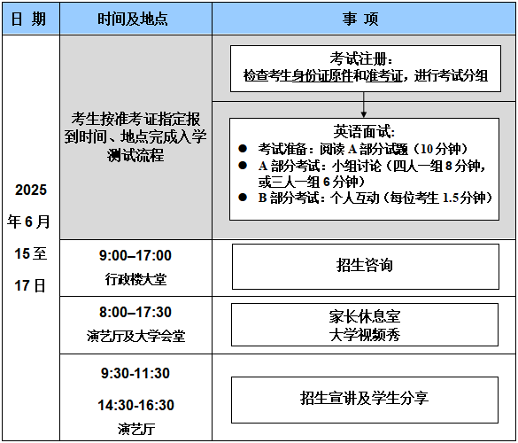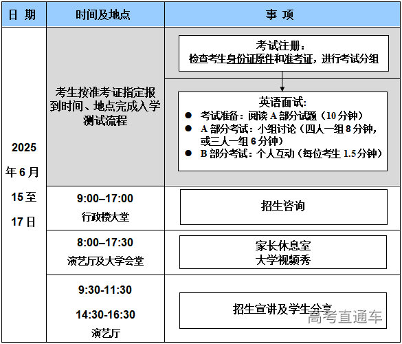 一、入学测试流程 注:6月17日仅考试半天,相关活动及会场将在中午12:30结束或关闭。