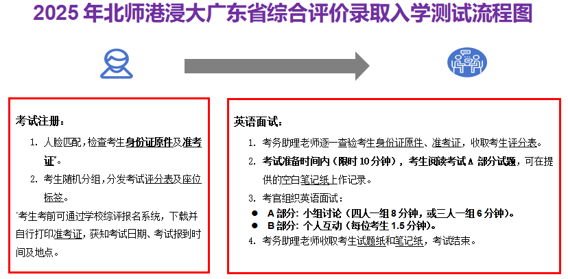 二、考生指引 1. 考试注册:考生须持本人有效身份证原件和准考证,按准考证注明的报到时间、地点进行考试报到。准考证可于6月5日14:00起在北师港浸大广东省综合评价报名系统下载,考生须提前自行打印(A4纸黑白、彩色打印均可;准考证正、反面不能涂改、书写或做任何标记;有涂改、书写或标记的准考证不得带入考场,否则将按考试作弊处理)。2025年北师港浸大广东省综合评价录取入学测试流程图见附件一。请考生按指定的报到时间及地点参加考试,逾时不候。 考生须持有效身份证原件和准考证入场,无需携带任何考试文具。考生不得携带手机或其他电子设备(如无线耳机、智能手表、运动手环、智能眼镜、电子存储记忆录放设备等)进入考场。考生完成整个考试流程预计约2个小时。请考生提前检查身份证的有效期限并妥善保管,电子身份证、护照、驾照、医保卡、户口簿等均不能作为入场身份凭证。如未持有有效身份证原件,则取消考试资格。 入场时学校将采用人脸识别技术核验考生身份,入场后注册课室老师将检查考生身份证原件和准考证。考生将被随机分组,每组4人或3人,分发考试评分表及考试座位标签(A、B、C或D)。 注册课室老师播放考试准备和英语面试演示视频。 2. 英语面试:考试开始前,考生被引导至考试课室。考生入考场前须将书包等物品放于指定位置。考试课室分为考试准备区及正式考试区。考试课室有2名考官和1名考务助理老师。 考试为全英文面试,包括A、B两部分内容: A部分 小组讨论(四人一组8分钟,或三人一组6分钟)。要求考生首先逐一针对A部分试题内容进行1分钟个人陈述,随后针对A部分试题指定的小组讨论话题进行小组讨论。期间考生不允许做笔记,但可以参考笔记纸和桌上的A部分试题。 B部分 个人互动(每位考生1.5分钟)。每位考生回答一个与小组讨论主题相关的问题。如果有必要,考生可以参考笔记纸,但不允许做笔记。B部分考试结束后,考生方可离开考试课室。考生不得将试题及笔记纸带出考场,离开考场后不准在考场附近逗留、交谈或者实施其他影响考场秩序的行为。 考试准备:考务助理老师在考场外检查考生有效身份证原件和准考证,收取考生评分表。考生根据分配的座位标签先在考试准备区就座,考官宣读考试要求。考生按考试指令在10分钟内阅读课桌上考试A部分的试题。考生可在提供的空白笔记纸上做笔记。笔及空白笔记纸由学校统一提供,考生无需自带考试文具。 正式考试:考试准备结束后,考生携带笔记纸和A部分试题根据座位标签就坐于正式考试区,考试随即开始。考生前来学校参加考试前,请预先仔细阅读附件二“考生须知(Instructions for Candidates)”。学校入学测试将对学生的语言流利度、沟通策略、逻辑思维、团队合作和组织能力等方面进行全面评估,以选拔适合北师港浸大博雅教育特色和英文教学环境的学生。考试全程录音录像。 3. 考场纪律:严禁携带手机、耳机、智能手表、运动手环、智能眼镜及其他电子设备进入考场。考生对考试内容负有保密义务,不得将考试内容传播、扩散出去。考生不得查阅未经授权的资料,如字典、参考书或其他资料。禁止代考、替考、集体作弊、未经许可擅自中途离开考场、使用假身份证的行为。考生需听从考场工作人员的指示,任何违反考试规则的考生将被取消考试资格。 4. 我校不组织任何形式的入学测试培训,也从未授权任何个人或机构开展考前培训、咨询、辅导或“保过”服务,请家长和考生们谨防误导或受骗。 5. 如遇特殊不可预见情况(如台风橙色或暴雨红色预警信号),考试时间将另行通知。 6. 入学测试期间,考生如有任何问题,可以联系学校招生办:0756-3620011,3620022,3620033,3620044,3620055,3620066,3620077,3620088。 7. 交通方案: 北师港浸大校园位于广东省珠海市香洲区唐家湾金同路2000号。 学校内及校园周边道路狭窄,没有足够场地停车,请考生绿色出行。 方案一:乘坐公共交通,到达珠海后 A、 广珠城轨:可在“唐家湾站”下车,后转乘Z82路公交车到“会同南路中”对面即可到达北师港浸大校园。查询公交路线,可关注“珠海公交巴士”微信服务号,进入“公交查询”—“实时查询”。Z82路公交车运营时间6:30—21:50,每半小时一班车。 B、 公共巴士:可在珠海市内乘坐公交到达“唐家湾站”,再转乘Z82路公交车到“会同南路中”,对面即可到达北师港浸大校园。 C、学校将另外安排由唐家湾站至北师港浸大校园的接驳车,请到达的考生及家长留意现场指引。 方案二:自驾 导航地址:珠海市唐家湾金同路2000号,到达后请依照指引停放车辆。 特别提醒:北师港浸大是无烟校园,校内所有场所禁止吸烟。请考生家长配合。 考场校园地图