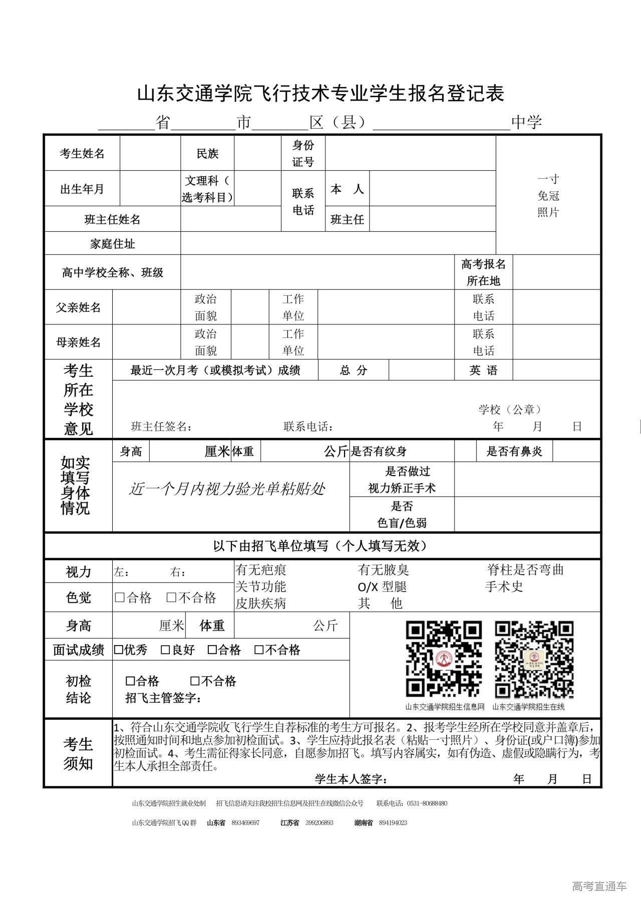 2. 考生须经过《中国民用航空招飞信息系统》注册报名、初检面试、体检鉴定(含心理测试)、申请确认有效招飞志愿以及民用航空背景调查。以上过程均合格者方能在填报高考志愿时报考本专业(招飞系统“有效招飞志愿”和高考本科提前批志愿均为山东交通学院)。