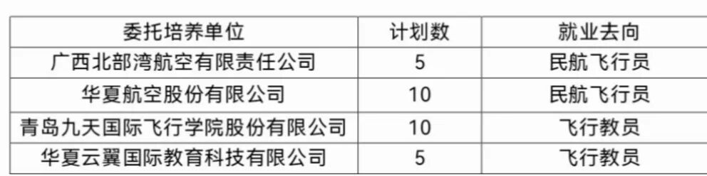 我校飞行技术专业实行订单式培养,学生通过航空公司或航校面试后与对应单位签署协议。截至目前,已有首都航空、乌鲁木齐航空、青岛航空、湖南航空、春秋航空、华夏航空、广西北部湾航空、青岛九天国际飞行学院、海南航空学校等多家单位委托我校招收飞行学员。