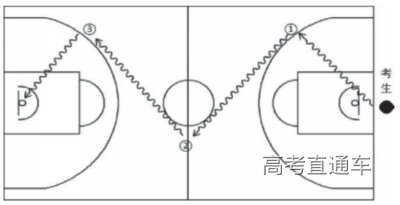 (1)考试方法:如图2所示,考生在球场端线中点外出发区持球站立,当其身体任意部位穿过端线外沿的垂直面时开始计时。考生用右手运球至①处,在①处做右手背后运球,换左手向②处运球,至②处做左手后转身运球,换右手运球至③处,在③处做右手胯下运球后右手上篮。球中篮后方可用左手运球返回③处,在③处做左手背后运球,换右手向②处运球,在②处做右手后转身运球,换左手向①处运球,在①处做左手胯下运球后左手上篮。球中后做同样的动作再重复一次,最后一次上篮命中后,持球冲出端线,考生身体任意部位穿过端线外沿垂直面时停止计时,记录完成的时间。每人测试2次,取最好成绩。