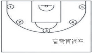 (1)考试方法:如图1所示,在以篮圈中心投影点为圆心,5.5米为半径所划的弧线上设置五个投篮点(球场两侧0度角处、两侧45度处和正面弧顶),每个点位放置5个球,共25个球。考生须从第1投篮点或第5投篮点开始投篮,按逆时针或顺时针方向依次投完每个点位的5个球。测试时间为1分钟。要求考生必须在弧线外投篮,球出手前双脚不得踩线,若踩线投中则计为无效投篮,不得分。每人测试2次,取最好成绩。