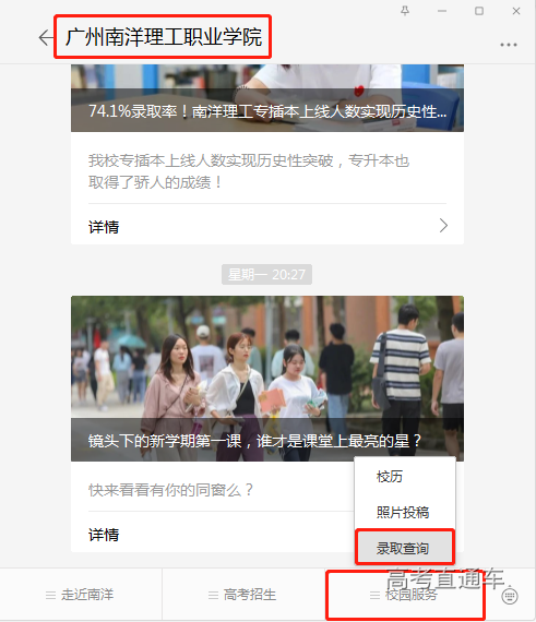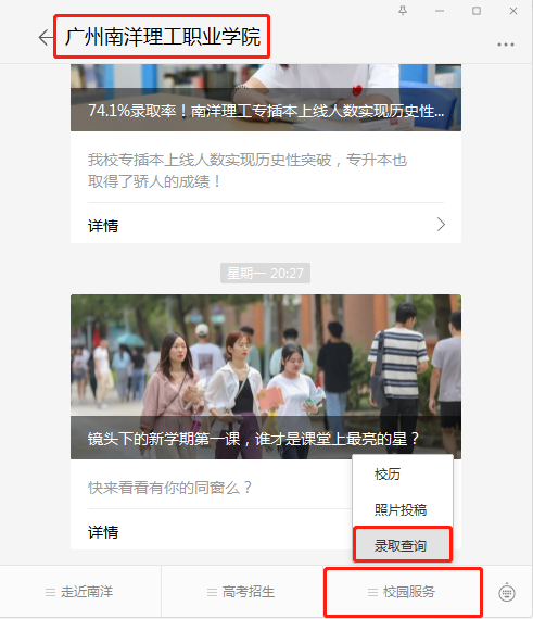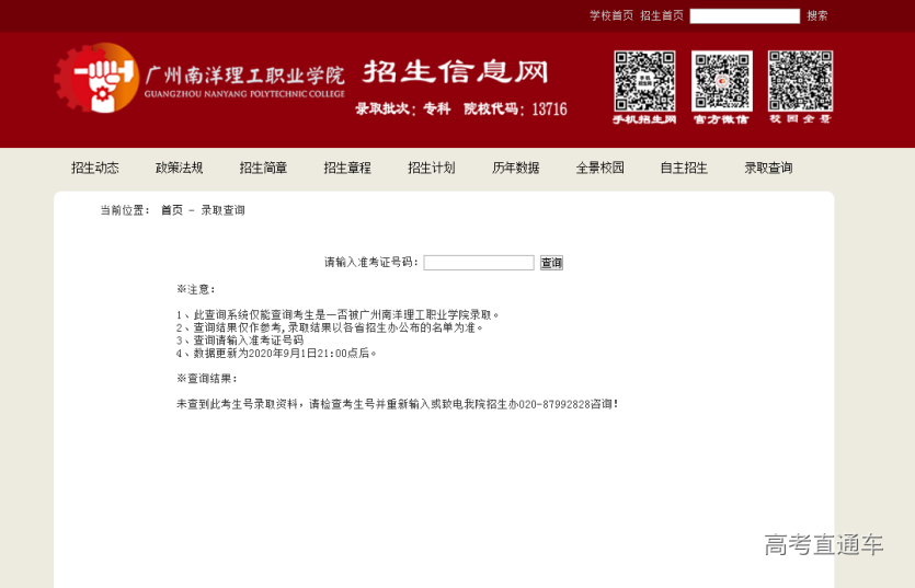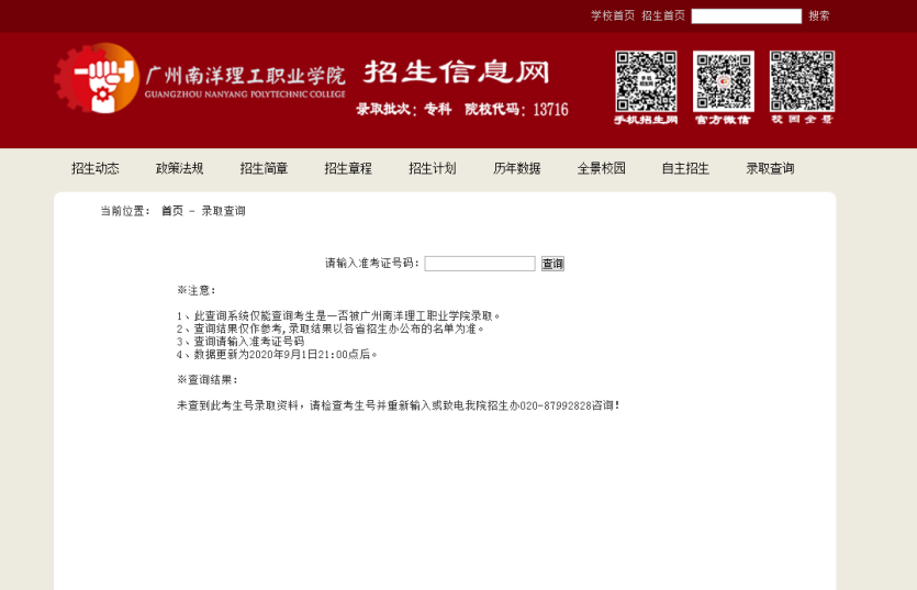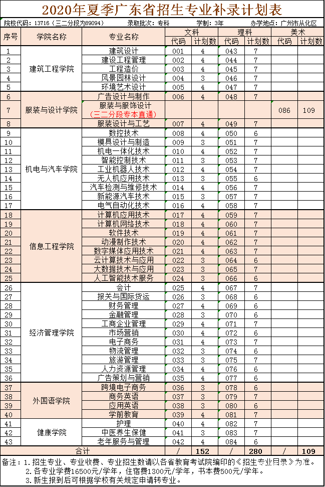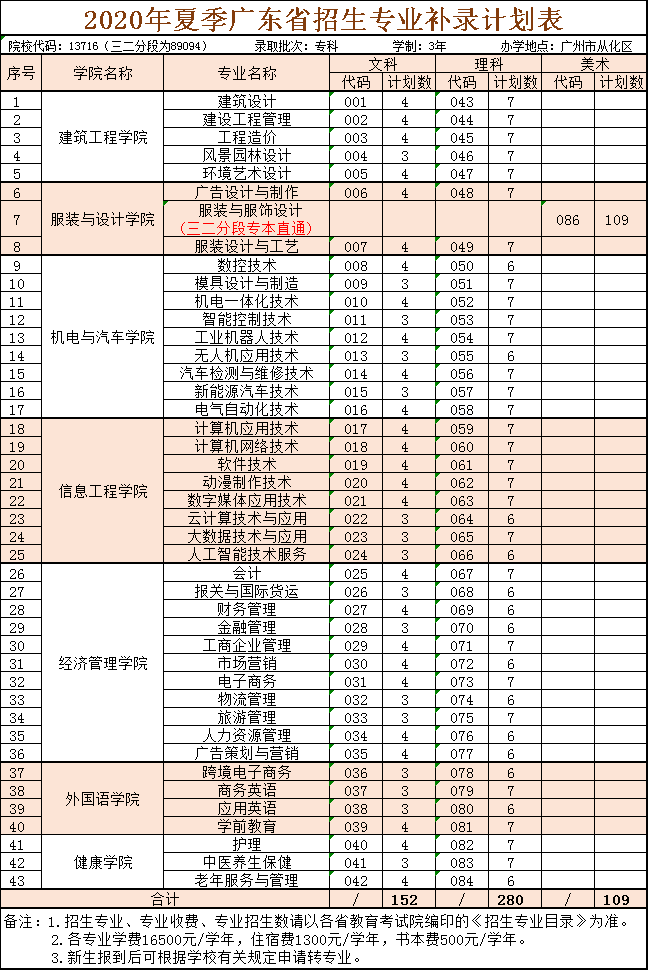 我校今年夏季高考省内招生计划共计2442人,截至目前,共录取考生1901人(文科500人,理科1325人,美术76人)。 广东省线上投档情况现已出炉,3D考生也可查询录取信息,考生可通过学校招生网、官方微信进行查询录取专业。 查询方法: ①学校招生网查询 网址: http://www.gznylg.edu.cn/zsb/index/search ②官方微信查询 微信号:gznyxy 考生只需在两个查询渠道输入准考证号,便可在录取结果公布后,第一时间查到录取信息,再也无须守着屏幕刷新网页啦! 第一次征集志愿即将开始 我校今年夏季高考省内招生现有541个招生计划将参加第一次征集志愿。 广州南洋理工职业学院 第一次补录计划 文科补录计划:152 理科补录计划:280 美术补录计划:109 招生代码:13716 注:其中服装与服饰设计专业(美术类)与广东科技学院开展三二分段专升本协同培养,专科分数线读本科,毕业后可拿到全日制本科毕业证书。 三二分段院校代码为89094 专业代码为086 广东省专科批次第一次征集志愿是9月4日10:00-5日12:00!还没被录取的考生,要抓紧时间参加征集志愿啦,南洋理工学院的2020年高考录取最后一趟末班车,也是到广州地区上大学最后的机会,不能再错过了! 征集志愿时间及办法 填报条件 省外专科院校征集志愿分数线:广东省外院校不降分征集志愿,即按《关于公布广东省2020年普通高校招生录取最低分数线的通知》(粤招〔2020〕9号)文执行。 省内专科院校征集志愿分数线: 文科类:总分130分。 理科类:总分130分。 美术类:文化科总分130分,美术术科150分。 其中,文科类、理科类高中学业水平考试科目(文科类为物理、化学、生物3门,理科类为思想政治、历史、地理3门,下同)成绩等级要求为3个D(含)以上。艺术类、体育类高中学业水平考试科目成绩等级要求为2个D(含)以上。 符合上述条件且未被录取的考生可参与本次征集志愿。 志愿征集时间及办法 9月4日10:00-5日12:00登录“广东省普通高考征集志愿填报系统”(www.eeagd.edu.cn/kszj)填报志愿。考生需在规定的时间内填报志愿,逾时一律不再受理。已被录取考生,不得参加征集志愿。考生在网上填报志愿后,须通过已绑定的手机号码获取验证码完成志愿确认。在规定的志愿填报时间截止后的1小时内(9月5日12:00-13:00),考生志愿信息不可修改,但仍可以获取短信验证码完成志愿确认。已在网上确认的志愿,考生可以有两次取消确认、再修改后确认的机会。投档录取以考生网上最后确认的征集志愿为准。 咨询微信号: 微信1:wxq00220 微信2:nylgxlb2 微信3:nylgxlb 招生咨询电话: 020-87992828;020-37987281 省外的小伙伴也请不要着急 这份外省录取日程表收藏好 我们南洋理工见 (点击可查看大图) 14问14答 你想要知道的这里都有 Q1:这次补录计划有多少? A1:我校有近600个补录名额,文理、美术类考生都可参与我校补录,其中我校服装与服饰设计(三二分段专业)计划充裕,考生如报考服装与服饰设计专业并被录取将以专科分数线入读专升本直通车专业,并在毕业后获得全日制本科学历。 Q2:学校往年的录取分数线是多少? A2:我校2019年夏季高考录取文科(包括补录)最低分120分,录取理科(包括补录)最低分116分,录取美术(包括补录)最低分302分。 Q3:学校是什么性质的学校? A3:我校创办于1984年,是广东省最早成立的民办职业类院校之一,2004年经省政府批准,教育部备案成为一所省属全日制民办普通高等专科院校,学制3年,批次第三批专科,院校代码13716。颁发毕业证是国家认可、教育部电子注册的普通高等学校专科毕业证书。 Q4:学校的校园环境如何? A4:我校地处广州后花园从化区,环境优美;36年办学历史,我校位列广东省民办专科院校第三名;地铁14号线上,交通便利;欢迎广大考生关注学校微信公众号在全景校园中查看我校。 Q5:学校的宿舍环境如何? A5:学校目前共有学生宿舍12栋,均为六人间。学生床尺寸为1.95m*0.9m;宿舍用品可自行携带,也可入学后在学校里购买;宿舍门禁时间为周日到周四晚上11:00,周五和周六晚上作适当延长;宿舍自来水免费,热水每月可领取补贴,每月可领40元,基本够用,宿舍用电每月每生补贴电费8度,即每宿舍补贴48度,超出范围需自行购电。 Q6:学校的收费情况是怎样的? A6:我校各专业学费16500元/年,住宿费1300元/年(空调六人间),书本费500元/年( 多退少补)。 Q7:学校的专业代号可以在哪里查询? A7:我校夏季招生专业目录的页码分别是:文科类P175、理科类P331和P332 、美术类P292和P298。 Q8:学校有专插本和专升本吗? A8:关于专升本,我校专升本属于自学考试类专升本性质,实行全国统考,毕业证盖主考大学章和省自考委的章,同等条件下,自考毕业证优于成考毕业证和远程教育毕业证的;关于专插本,考生可在毕业当年1月报名由省考试院组织的全省高校本科插班生考试,考试时间一般是同年的3月份。 Q9:学校就业条件如何? A9:学校坚持“五高标准”,即就业率高、专业对口率高、起始薪酬水平高、就业现状满意度高、用人单位满意度高等“五高标准”,确保毕业生高质量就业。我校就业率近年来都保持在98%以上,学生就业领域广泛,就业岗位多为企业技术管理骨干。 Q10:请问我分数比省控制线低,有机会报读南洋理工吗? A10:由于高考志愿填报改革,实行平行志愿录取,根据往年录取经验,在第一次投档结束未完成计划的学校省招办会组织征集志愿(重新填报志愿再次录取),而今年省内专科院校征