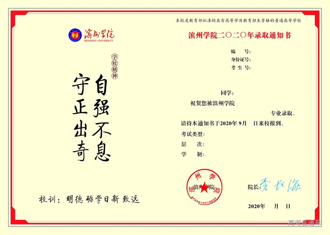 滨州学院录取通知书