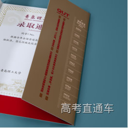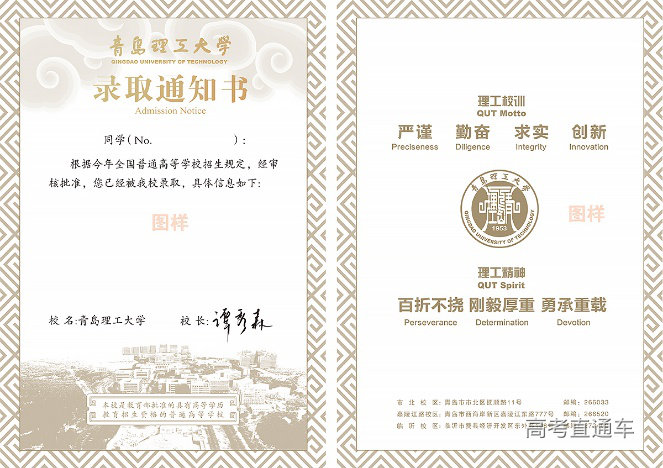 通知书内纸采用特种纸烫金及印金工艺,嵌于通知书封套内部。封面最上方的主标题“青岛理工大学”校名中英文及“录取通知书”中英文字样采用“烫印压金”工艺。上侧底纹为祥云图案,寓意吉祥。底部底纹为青岛理工大学嘉陵江路校区鸟瞰图线稿图。正文部分为打印版个人录取信息,校名印鉴及校长签名。整体图案使用专色印金工艺,寓意“金榜题名”、“前程似锦”,使得本录取通知书更具收藏和纪念意义。