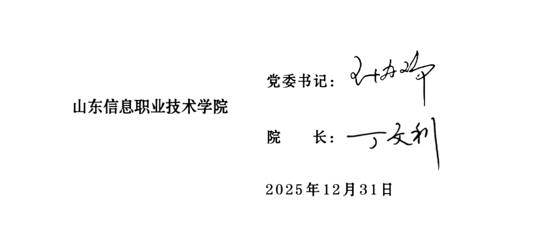 实干担当谱华章 同心奋楫启新程 亲爱的老师们、同学们,各位校友,社会各界的朋友们: 律回春晖渐,万象始更新。值此辞旧迎新的美好时刻,我们谨代表山东信息职业技术学院党委和行政,向辛勤耕耘在教学、科研、管理、服务一线的全体教职工,向勤学笃行、逐梦成长的全体同学,向心系母校、砥砺奋进的广大校友,向关心支持学校事业发展的社会各界朋友,致以最衷心的感谢和最诚挚的新年祝福! 2025年,是学校高质量发展的突破之年、丰收之年。一年来,全体师生坚持以习近平新时代中国特色社会主义思想为指导,深入学习贯彻党的二十大和党的二十届二中、三中、四中全会以及全国全省教育大会精神,牢牢把握职业教育类型定位,锚定“一三五五十”发展战略目标,勤勉奉献,担当作为,用“有解思维”攻坚克难、开拓创新,以“想干事、能创新、勇突破”的奋进姿态,汇聚起推动发展的磅礴力量,在党建引领、教学改革、产教融合、人才培养等各领域勇毅前行、硕果盈枝,成功入选山东省高水平高职学校立项建设单位,用实干与担当书写了学校高质量发展的新篇章。 这一年,我们初心如磐、凝心铸魂,党建引领作用持续彰显。深入学习宣传贯彻习近平总书记关于教育强国建设的重要论述,扎实推进深入贯彻中央八项规定精神学习教育,筑牢坚定拥护“两个确立”、坚决做到“两个维护”的思想根基。创新“三化”党建工作模式,深化“五融五促”校企党建联建机制,17个党组织、128名党员获评省市级以上荣誉。在经济日报、中国教育报等国家级、省级重点媒体刊发典型经验346篇,做客中央七台《军校,我来了》、中央教育电视台《职教中国》介绍办学经验做法和特色成果,学校年度入选山东高职院校“综合影响力十强”、获评“智媒传播影响力高校”,党建与事业发展深度融合的生动局面全面形成。 这一年,我们强基固本、立德树人,人才培养质效全面提升。构建“一核两翼四维”大思政格局,实施“14544”全环境立德树人工程,建成省市级思政“金课”3门、立项思政课题3项、获思政荣誉21项。优化专业布局,打造“2+3+4”雁阵式专业群协同发展新格局,37个招生专业与山东省“十强”产业、“6997”现代化工业体系和标志性产业链精准对接匹配,获评2个山东省职业教育高水平专业群、2个山东省职业院校品牌专业群。2名教师入选“山东省技术能手”,引进12名高级技术职称人才、15名博士学位高层次人才,荣获山东省职业院校教学能力大赛二等奖1项、三等奖1项,政府举办的教学比赛17项。深化“AI+”教学改革,建成容量达7520.45GB的优质数字化资源库,11部教材入选“十四五”职业教育国家规划教材目录,校企合作开发课程778门。学生在技能竞赛屡创佳绩,荣获世界职业院校技能大赛银奖1项、铜奖4项,山东省职业院校技能大赛金奖1项、银奖4项、铜奖6项,各级各类竞赛获奖237项,以赛促教、以赛促学育人成效凸显。 这一年,我们聚势赋能、协同共生,产教融合能级持续跃升。新参与国家行指委(教指委)3个,参加国家行业产教融合共同体6个,牵头成立潍坊市网络安全市域产教联合体,“两体”平台建设筑牢协同育人根基。与华为、宁德时代等百余家行业领军企业深度合作,共建11个产业学院、590个校内外实训基地,潍坊网络安全现代产业学院成功入选市级培育建设名单。创新“校园+产业园”协同育人模式,学生团队深度参与企业真实项目研发,典型经验做法“AI+教育,推动产教深度融合”在山东卫视《新闻联播》播出推广。发挥职业教育资源优势,开展企业数字化转型培训22期,服务企业3万多家,技术服务成果丰硕,为区域产业升级注入强劲动能,成功构建校企协同发展的良好生态圈。学校入选国家职业教育东部地区“产教融合”指数TOP10%榜单。 这一年,我们筑基强能、提质增效,办学支撑能力不断夯实。建成12.5P算力的华为、英伟达双栈AI算力平台,自研“信达家族”AI智能体矩阵,升级建设智能机器人服务中心、市域网络安全产教融合创新中心等实践基地,实现实践教学与岗位需求精准对接。深化数字化校园建设,核心业务系统100%信创适配迁移,建成“智慧山信”服务中枢,多次获评省级信创案例。推进校园文化建设和环境改造,开通奎文校区校园东门,新增建筑面积5380㎡、绿化面积7000㎡、校园“打卡地”8处,为师生打造了更加美好优质的校园环境。学校获评“山东省学校安全工作先进集体”,内部审计案例获评2025年度全省优秀研究型案例,为高质量发展提供坚实保障。 这一年,我们铺路搭桥、多维赋能,招生就业质量显著提高。构建多批次多类型招生体系,今年录取最高分578分,为全省专科录取最高分。构建中职、高职、本科纵向贯通培养体系,与5所本科学校开展“3+2”贯通培养,与15所中职学校联合举办五年制高职教育,为学生搭建多元成才“立交桥”。实施就业优先战略,开展企业接待日、访企拓岗行动,建立“线下宣讲+线上双选”立体化招聘体系,搭建优质就业资源库,吸引1600余家企业参与,提供岗位9000余个,2025届毕业生毕业去向落实率达95.31%。立项省人社厅“就业创业赋能中心”建设,荣获山东省大学生创新大赛铜奖3项、创业计划竞赛奖项5项、大学生职业规划大赛2项及其他省级及以上项目荣誉168项,学生就业创业竞争力持续提升。 这一年,我们五育融合、