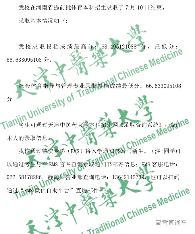 天津中医药大学2023年在河南省提前批体育本科招生录取情况