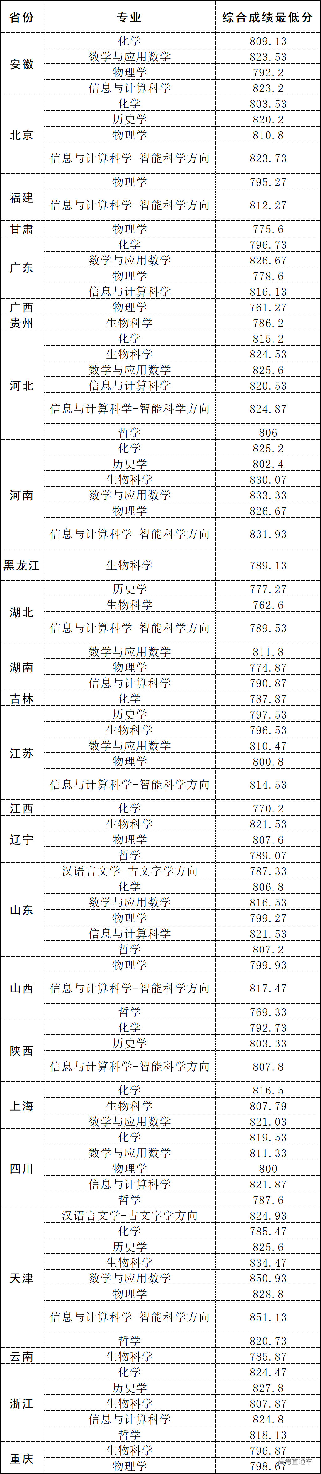 根据《南开大学2025年强基计划简章》要求,我校已完成2025年强基计划考核测试、分数核算等工作。经学校招生工作领导小组审定,我校确定2025年强基计划拟录取资格名单,现将各省份相关专业录取最低综合成绩公布如下。考生可登录南开大学强基计划报名系统(https://bm.chsi.com.cn/jcxkzs/sch/10055)查询具体成绩及录取状态。