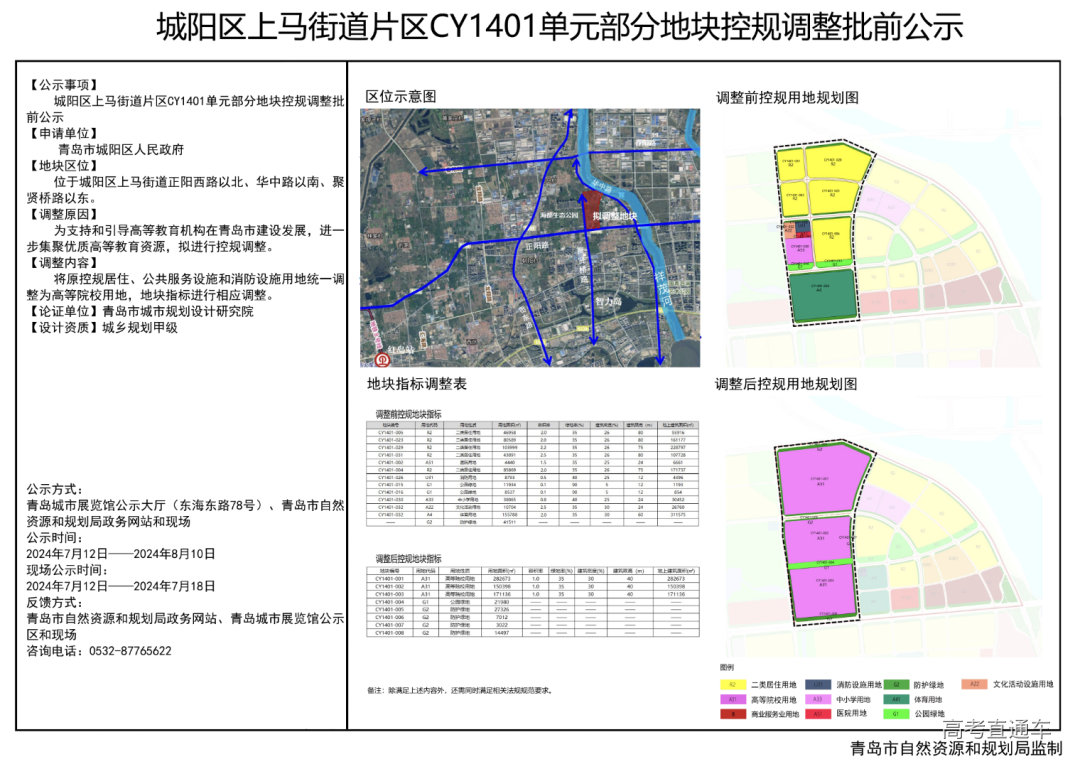 近日,青岛市自然资源和规划局对上马街道CY1401单元部分地块控规调整进行了批前公示。
