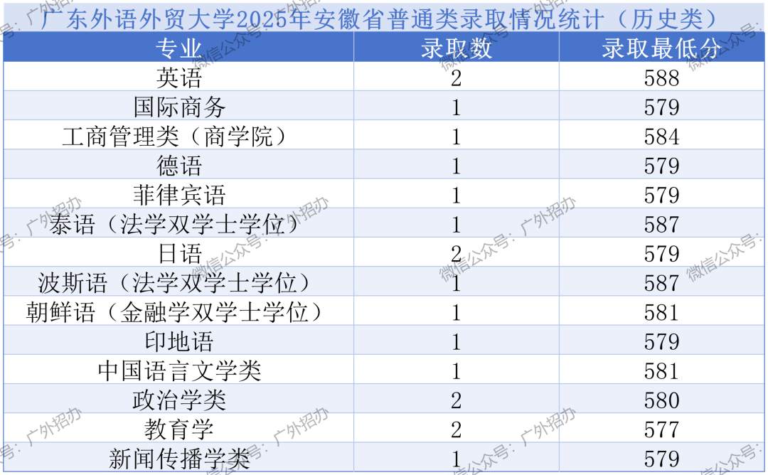 广东外语外贸大学2025年在安徽高考各专业录取分数线