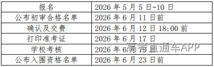初审通过的考生需于2026年6月12日18:00前登录报名系统进行考试确认,确认后交纳报名费30元、面试费50元,并于2026年6月17日后打印准考证。