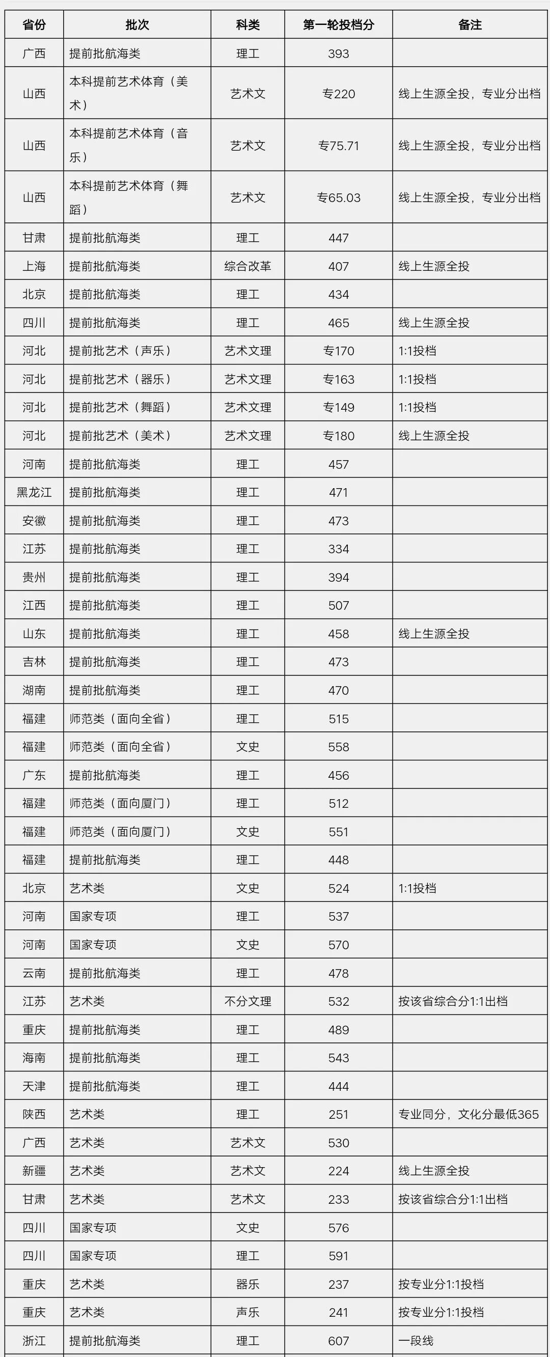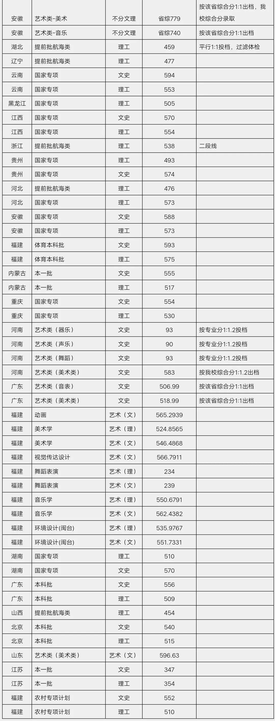 面向全省(理工):512 面向全省(文史):562 面向厦门(理工):498 面向厦门(文史):550 闽台合作项目(理工):505 招生录取进度表 我校2019年普招录取查询系统已开通 欢迎大家点击阅读原文查询录取结果 · 注:"√"表示该省该批次已提供录取查询数据;"-"表示该省该批次无招生任务。空白表示该批次还未进行或正在进行中。 集美大学2019年招生省份投档线 (陆续更新中)