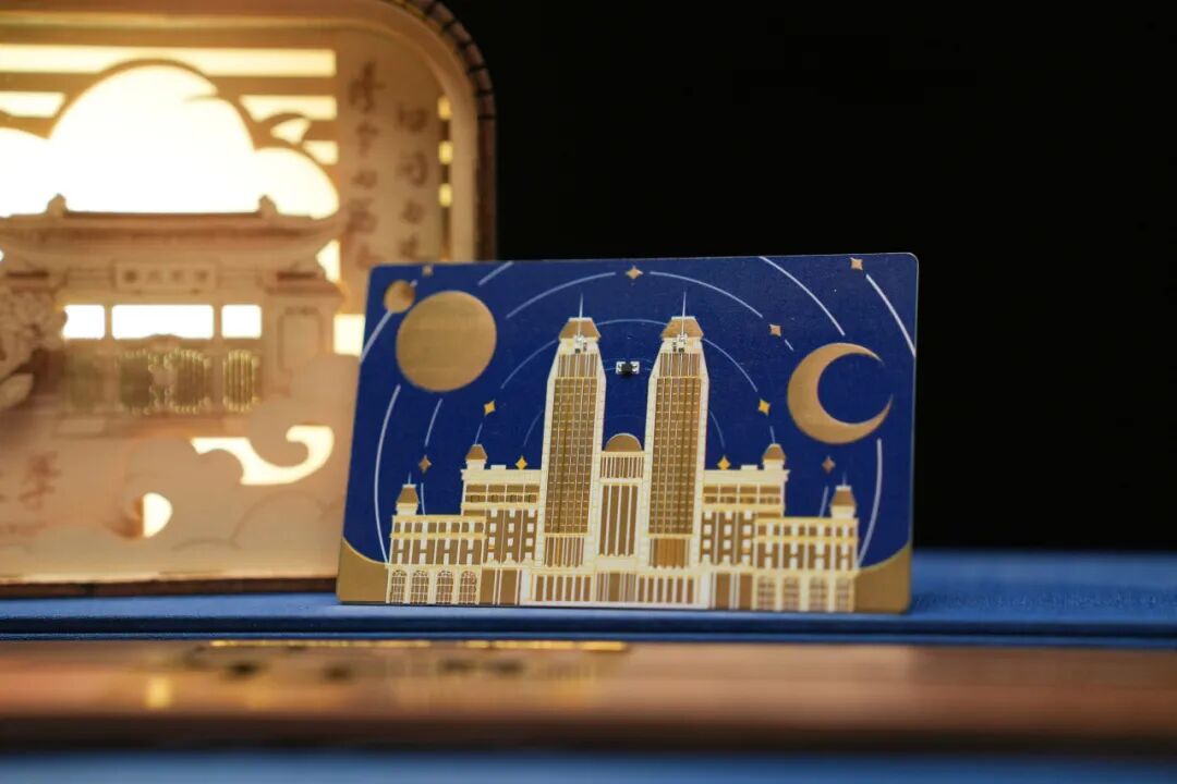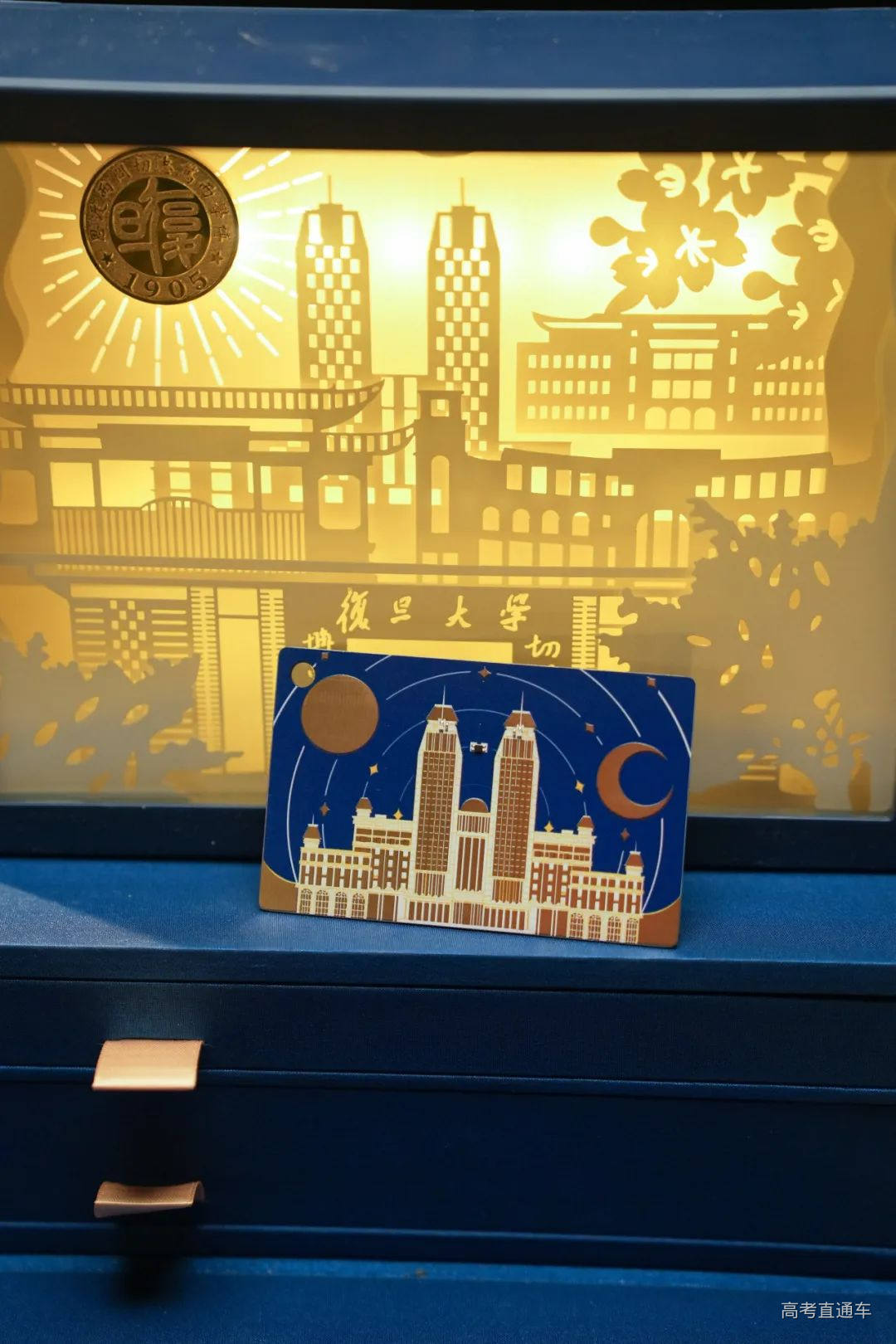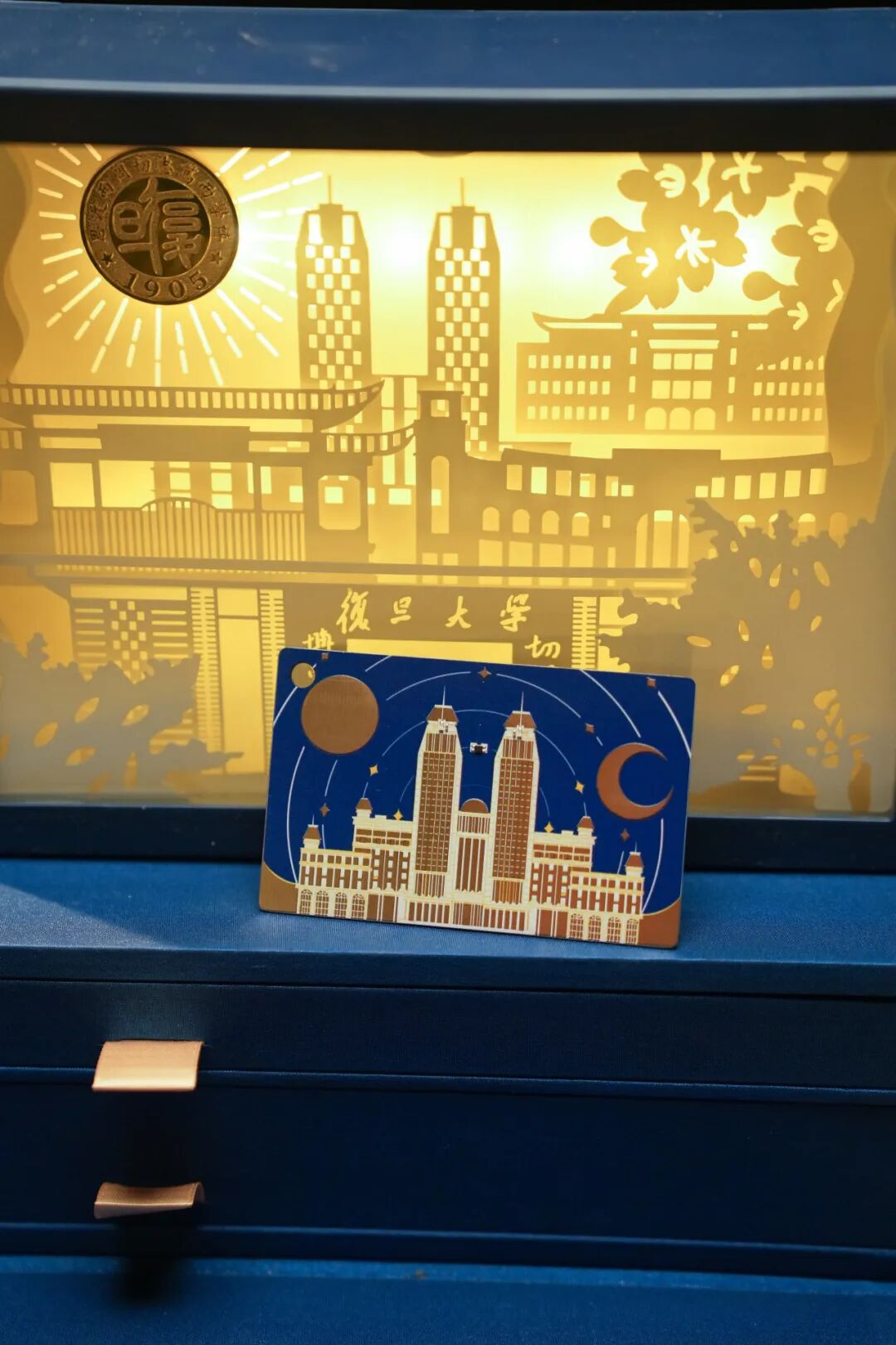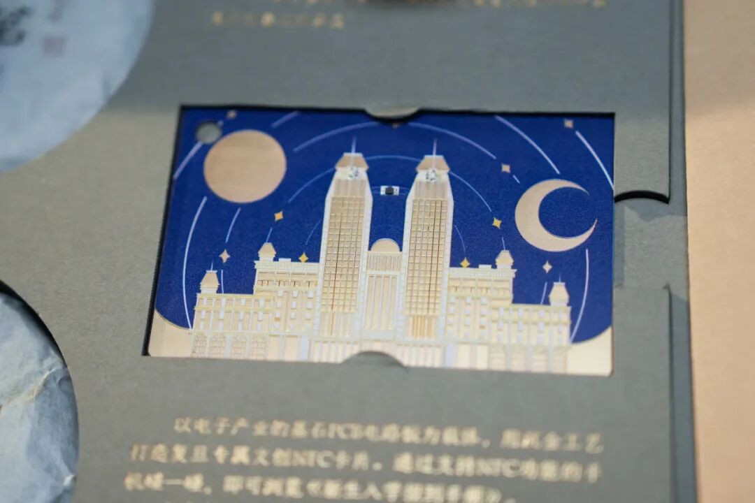 两饼茶砖旁,是一枚复旦专属文创NFC卡片。 卡面图案源自复旦文创设计大赛获奖作品《三原色·复旦光》,设计者是24级基础医学院的硕士生仇崇海。 仇崇海介绍,文创设计灵感源自“日月光华,旦复旦兮”。“创作过程中,我构思如何将复旦蓝、光华楼与日月元素自然融合。最终引入星轨,将日月纳入同一画面。绘制时,我特意抬高太阳位置,以营造‘日升月落’的时间流转意境。”