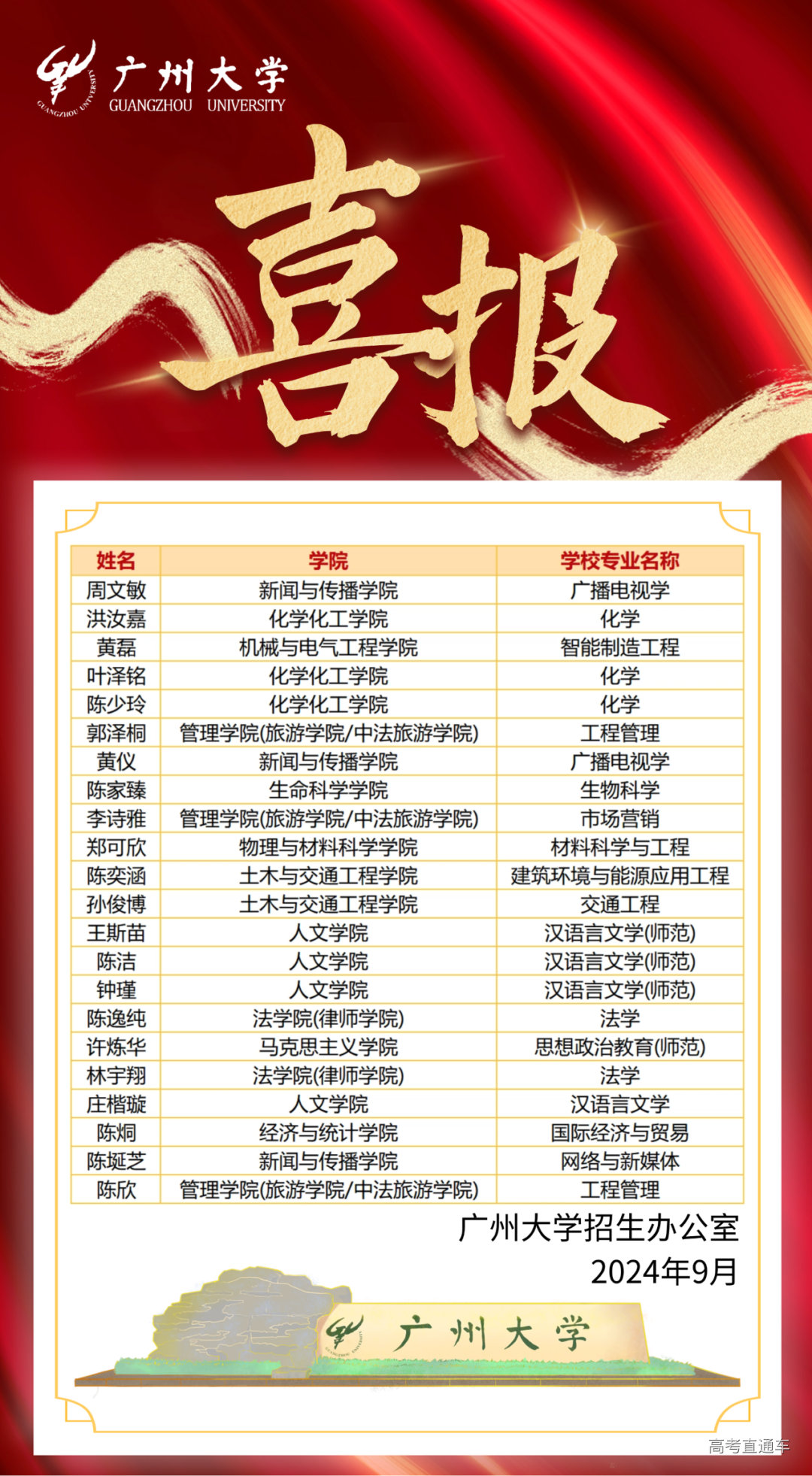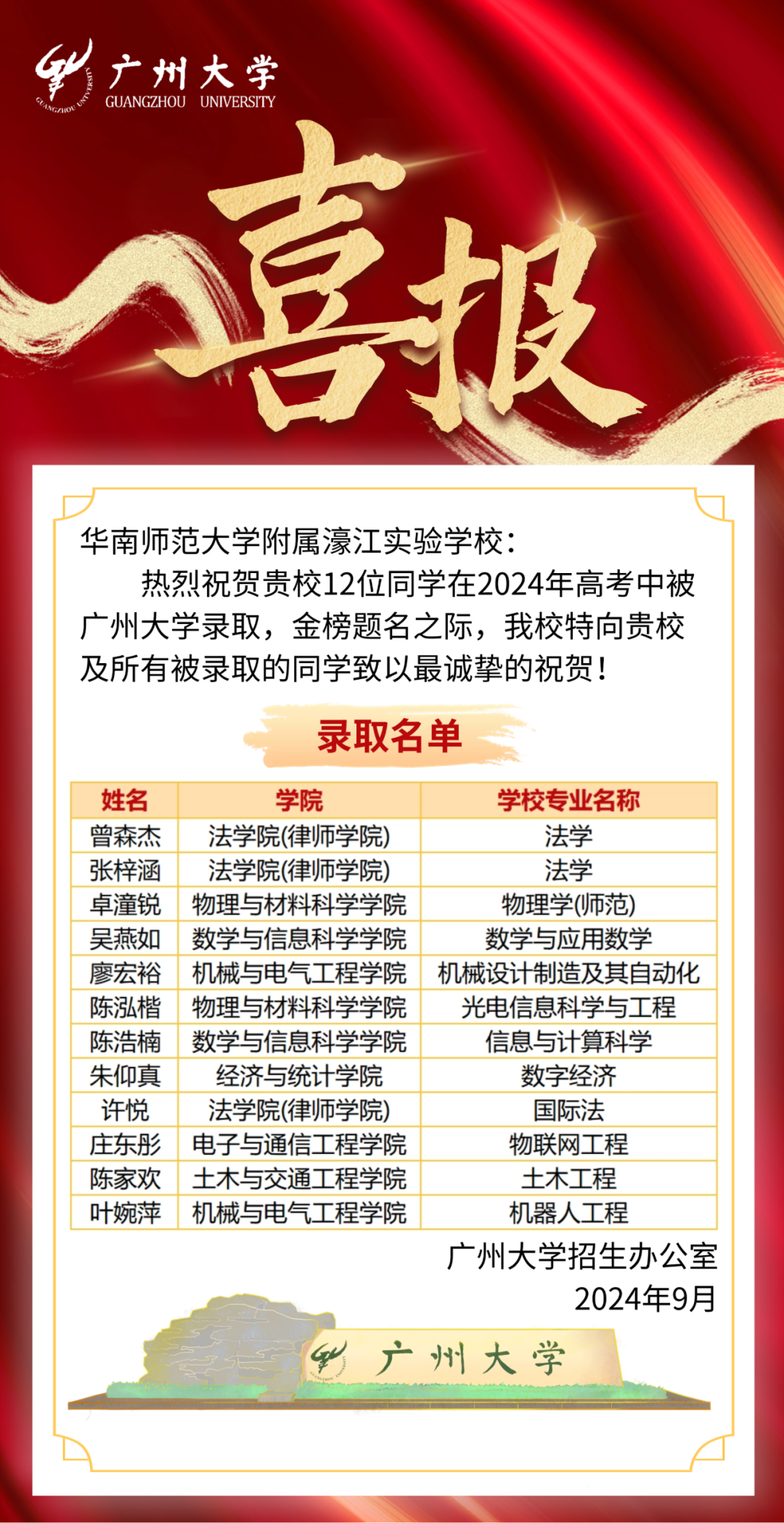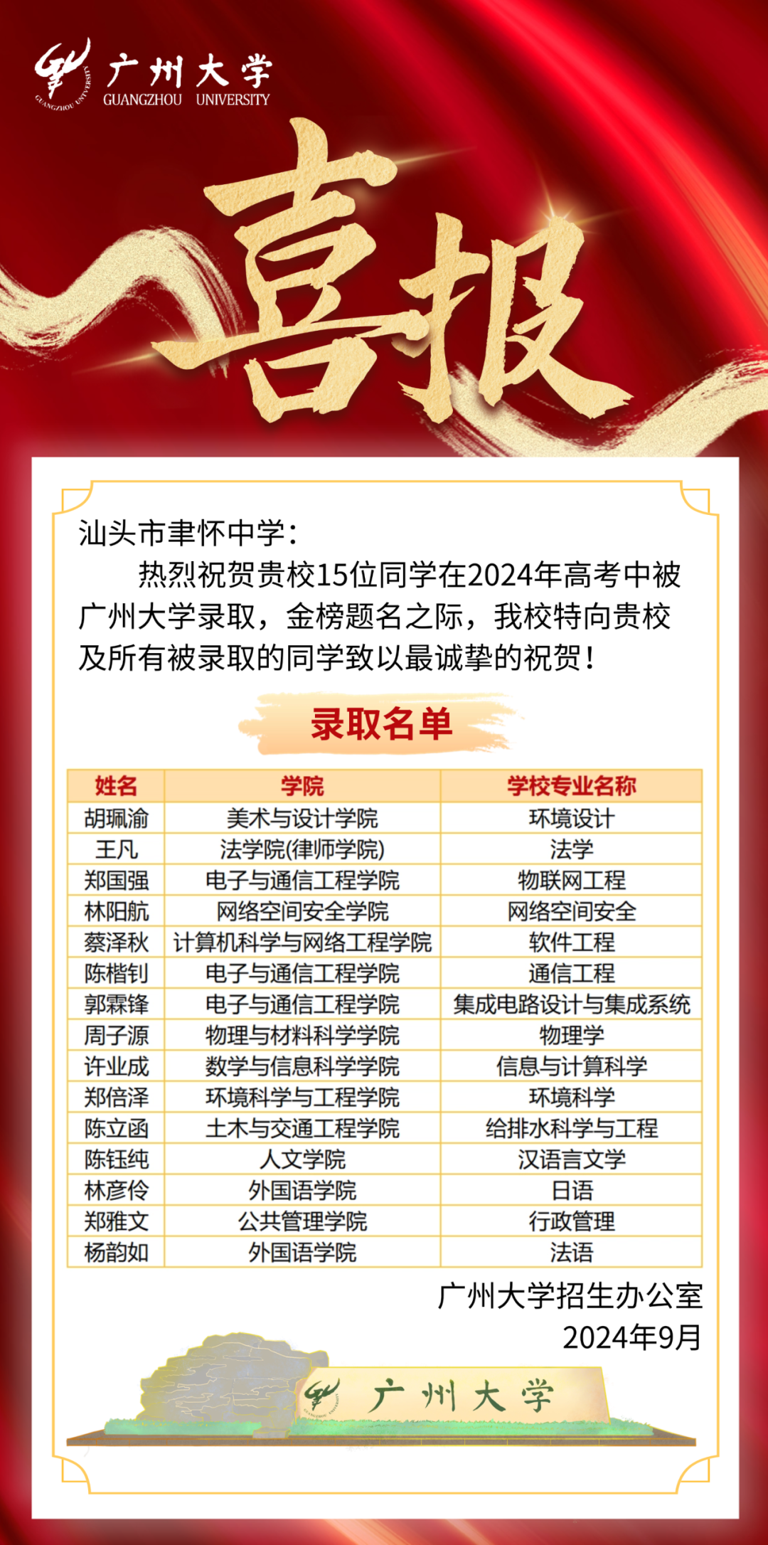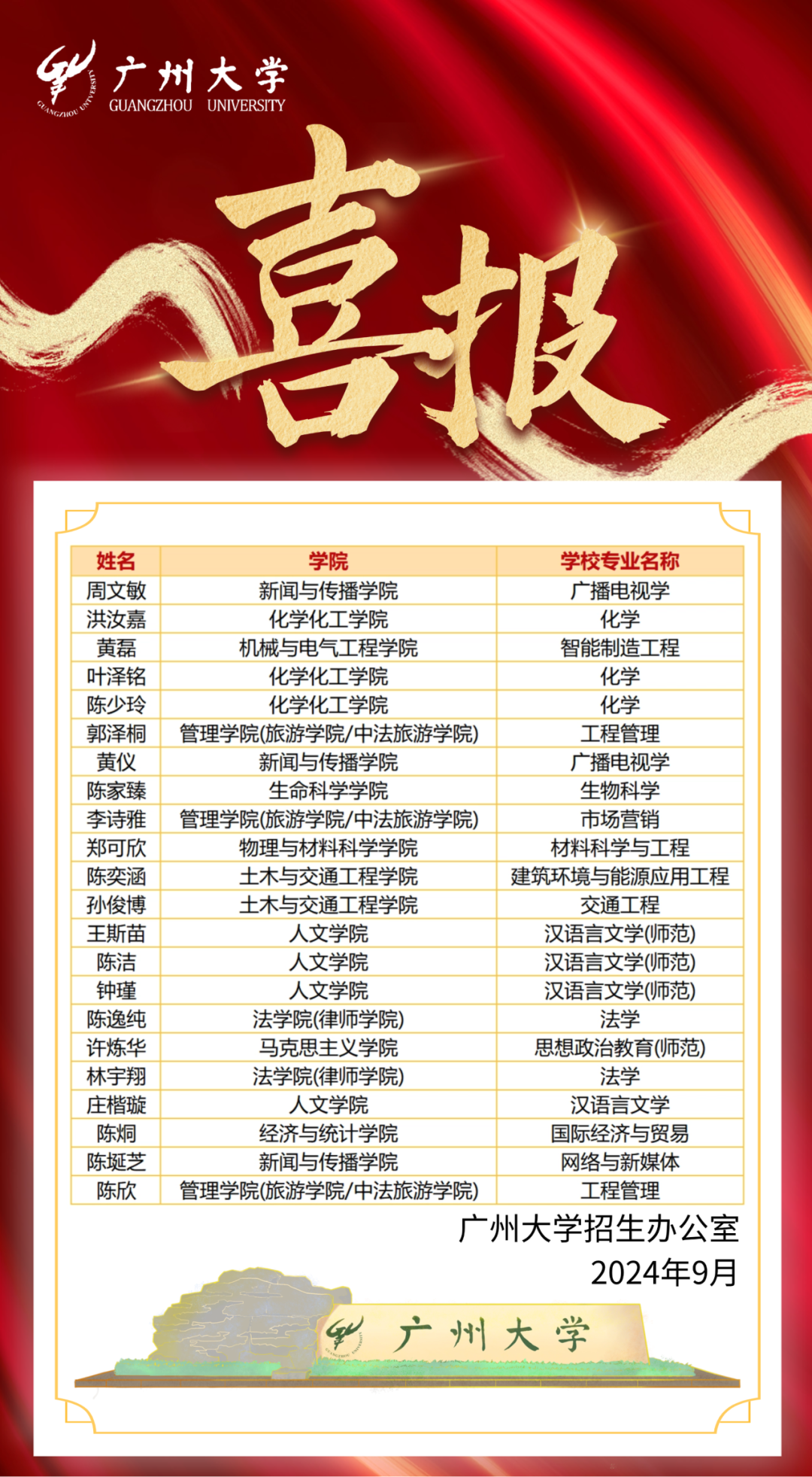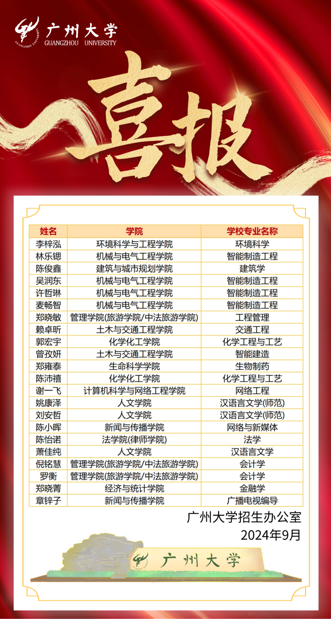 2024年招生工作已顺利结束。我校满怀感激之情,衷心感谢各生源中学一直以来对广州大学招生工作的支持,向我校不断输送优秀学子。
