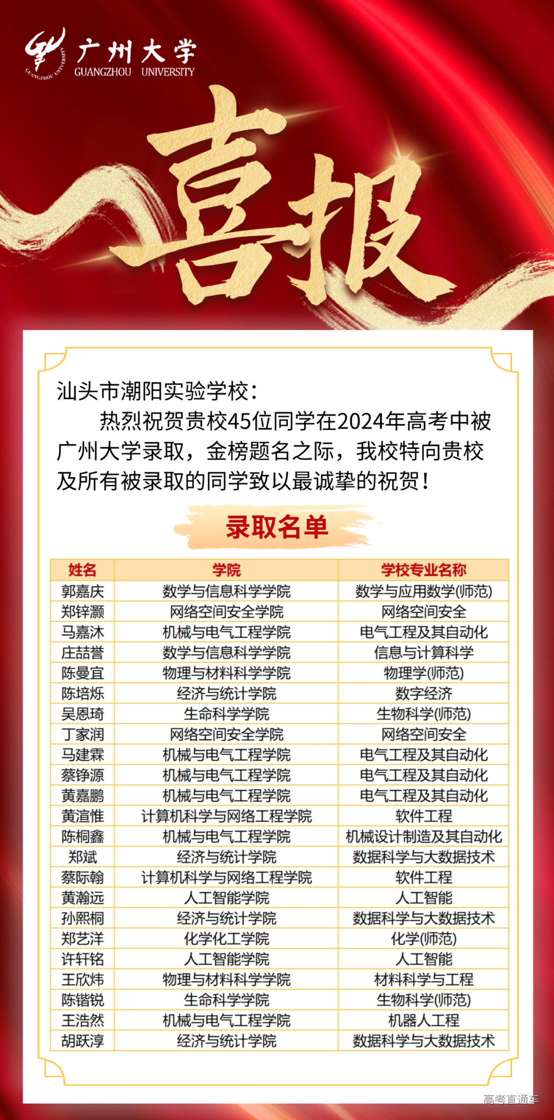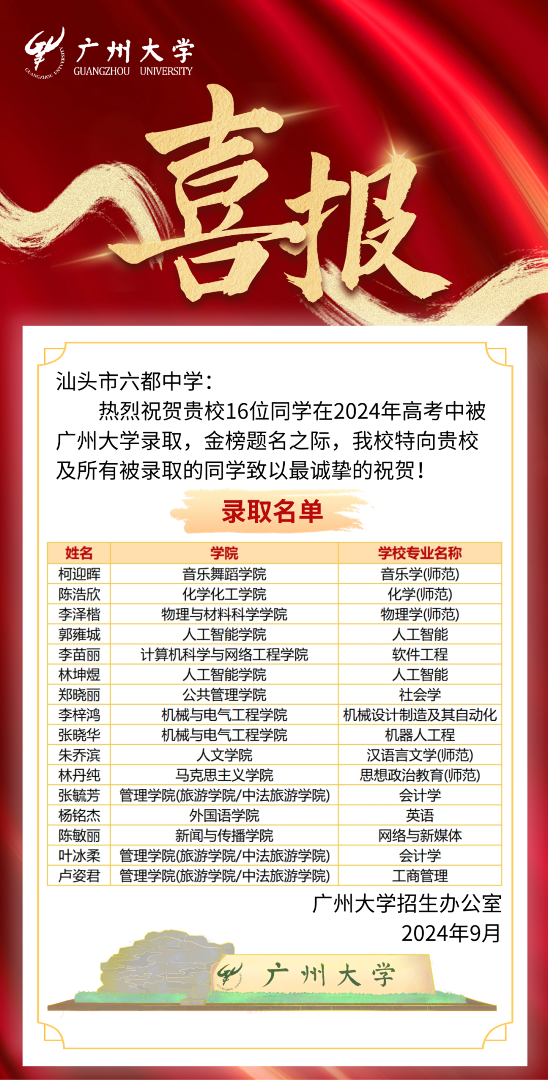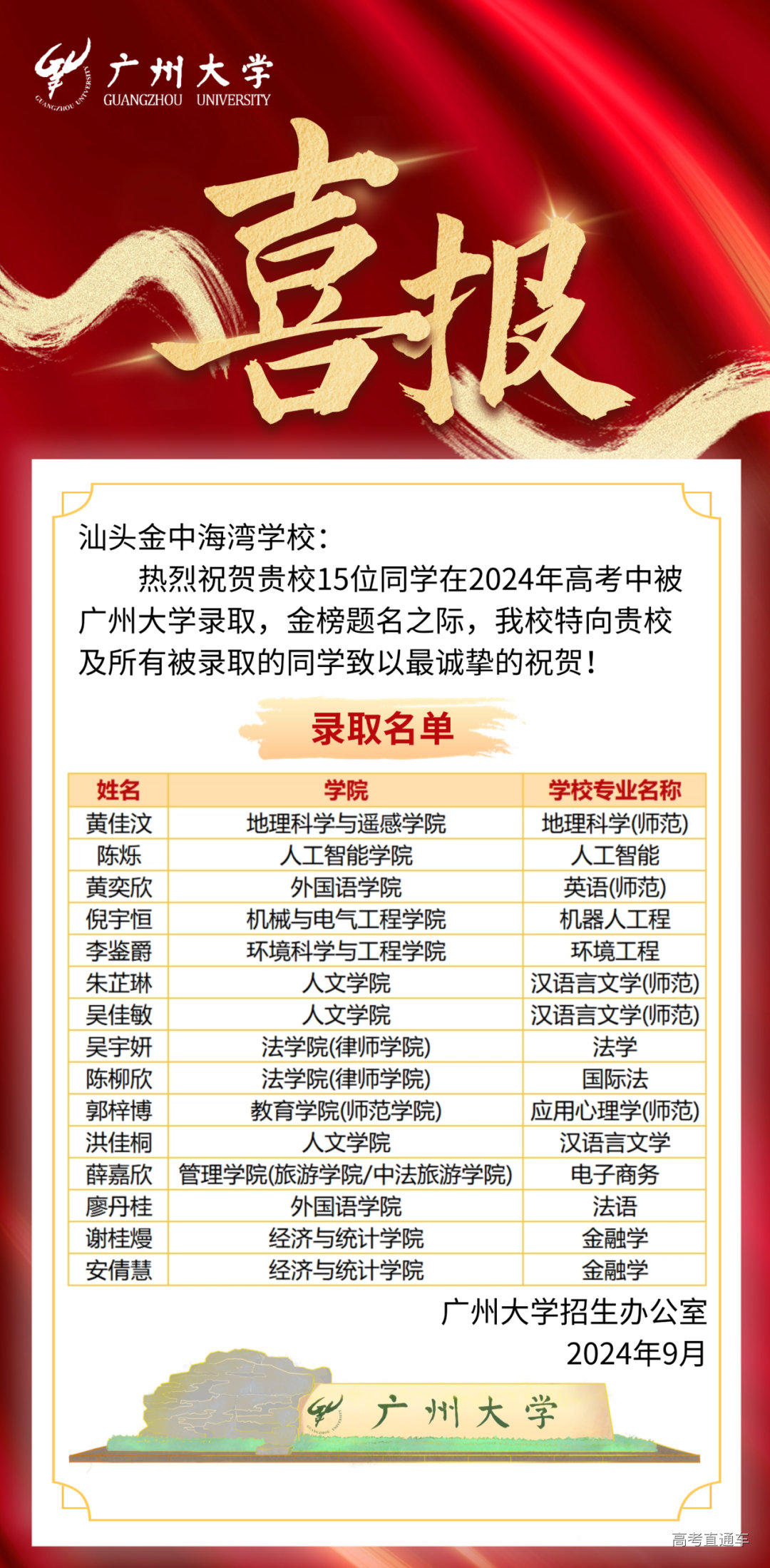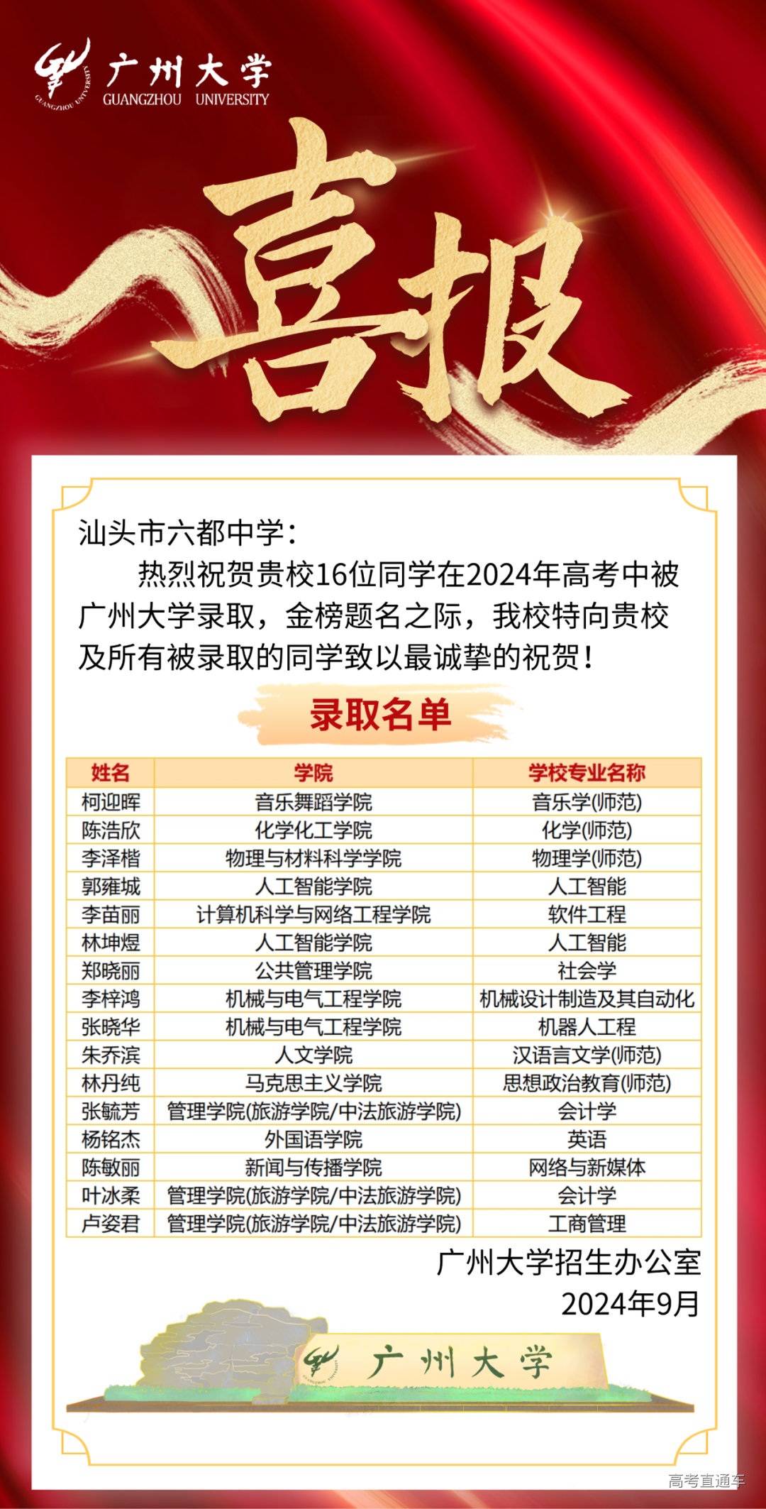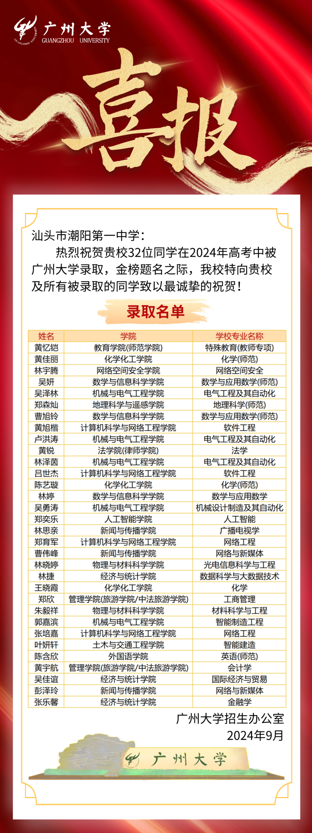 下面是2024年我校在汕头市录取详情(录取人数10人及以上,按人数排序),欢迎更多优秀学子加入广州大学,再次向这些生源中学致谢!祝贵校高考再创佳绩!