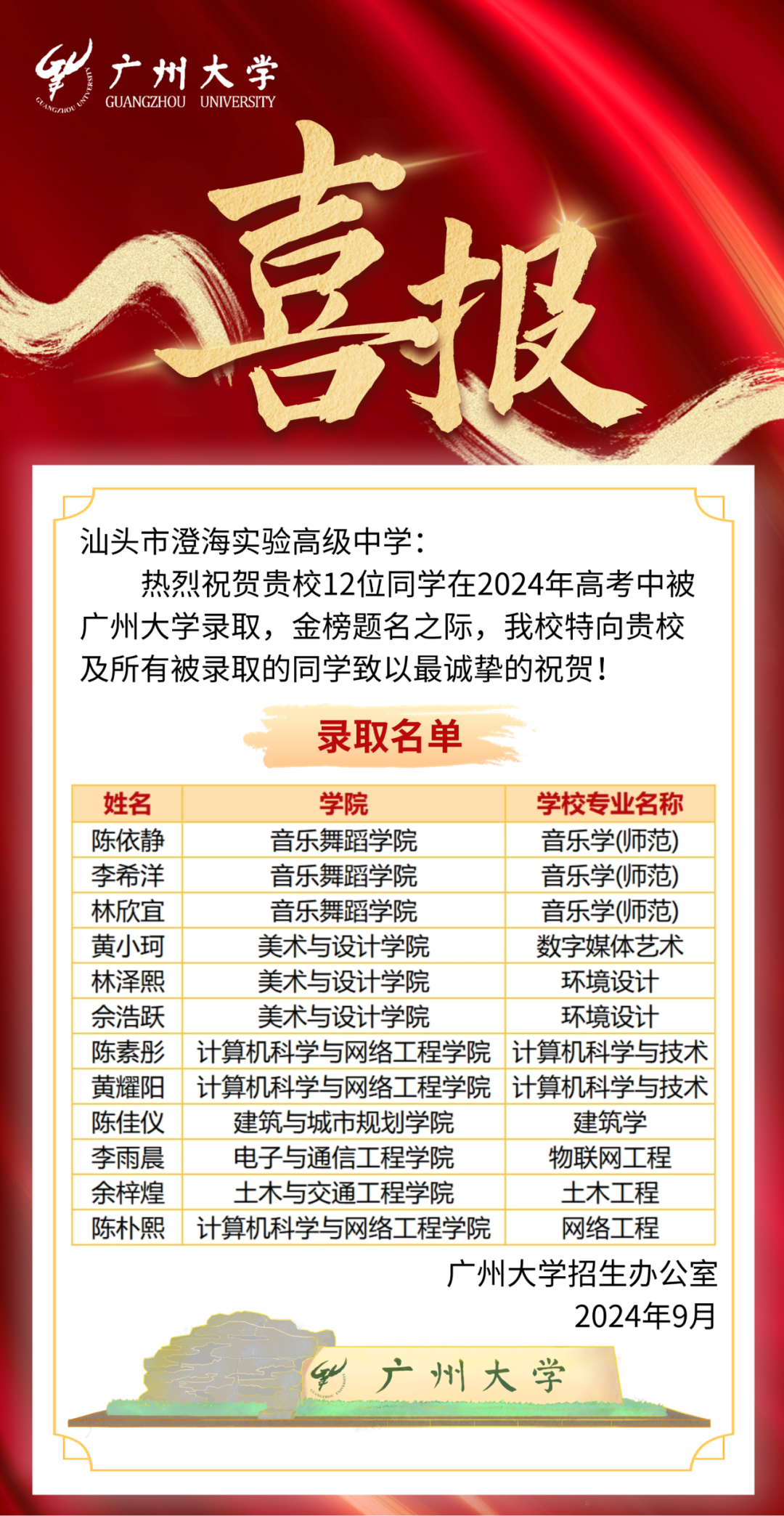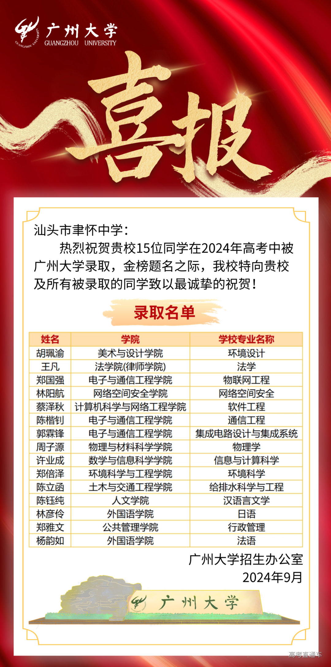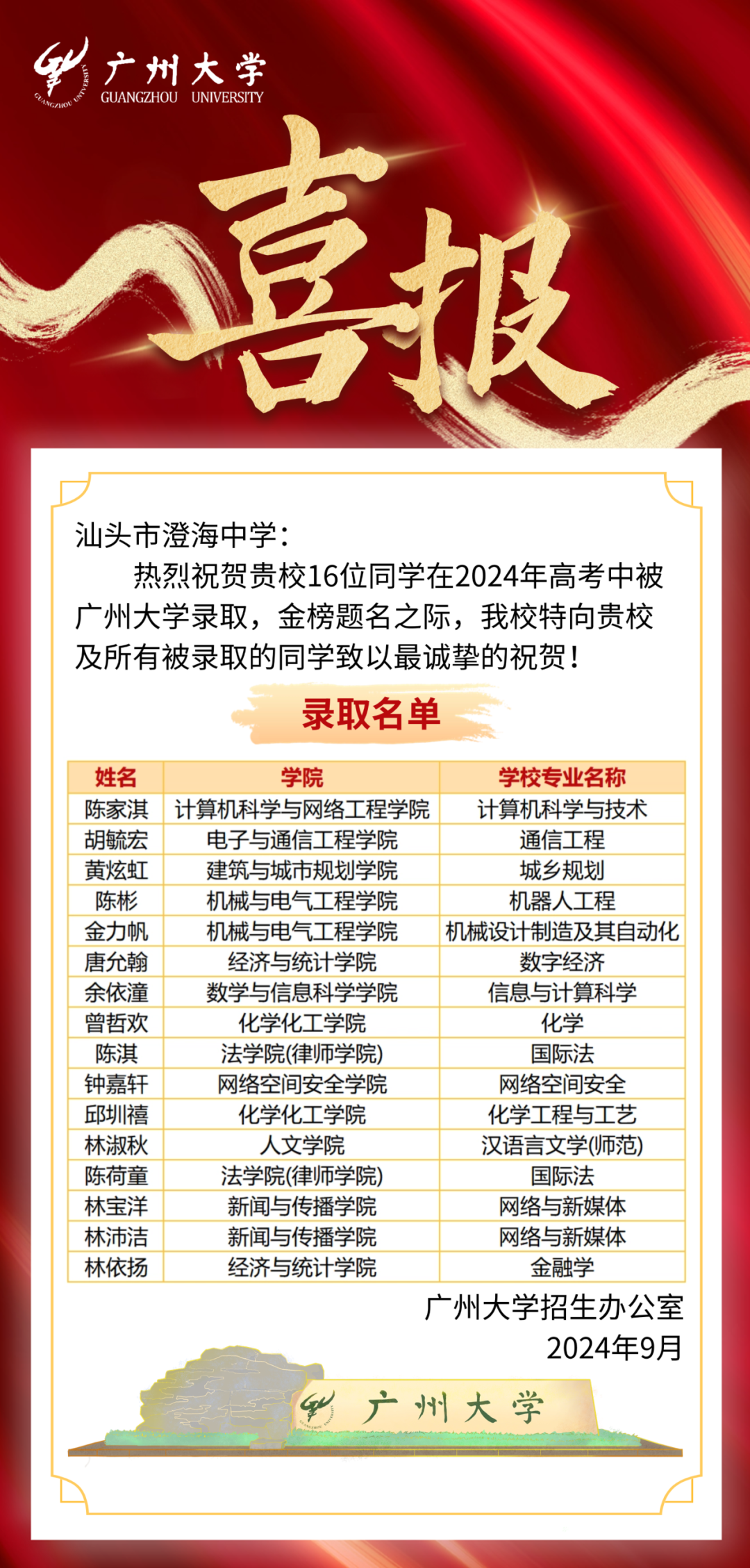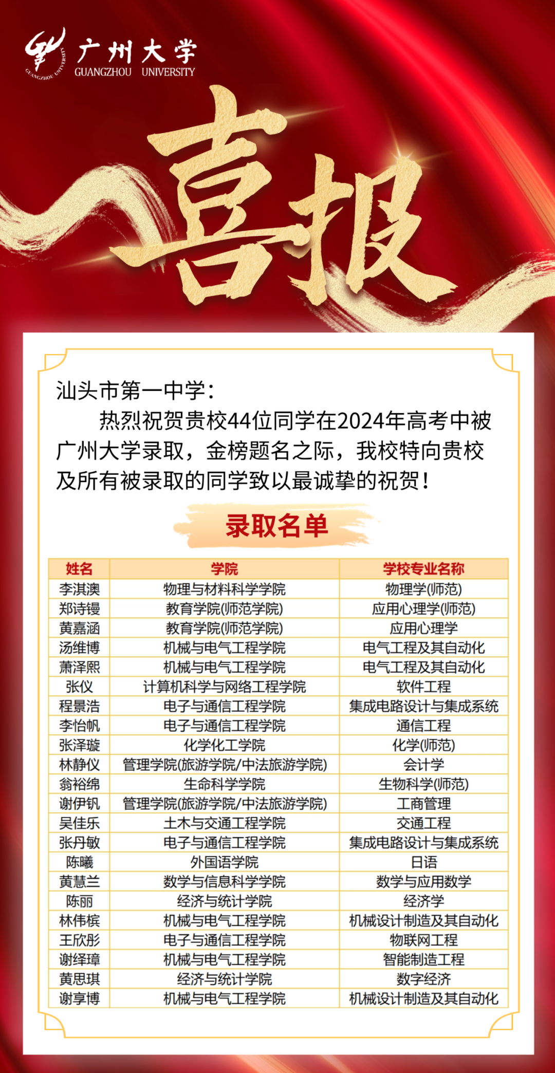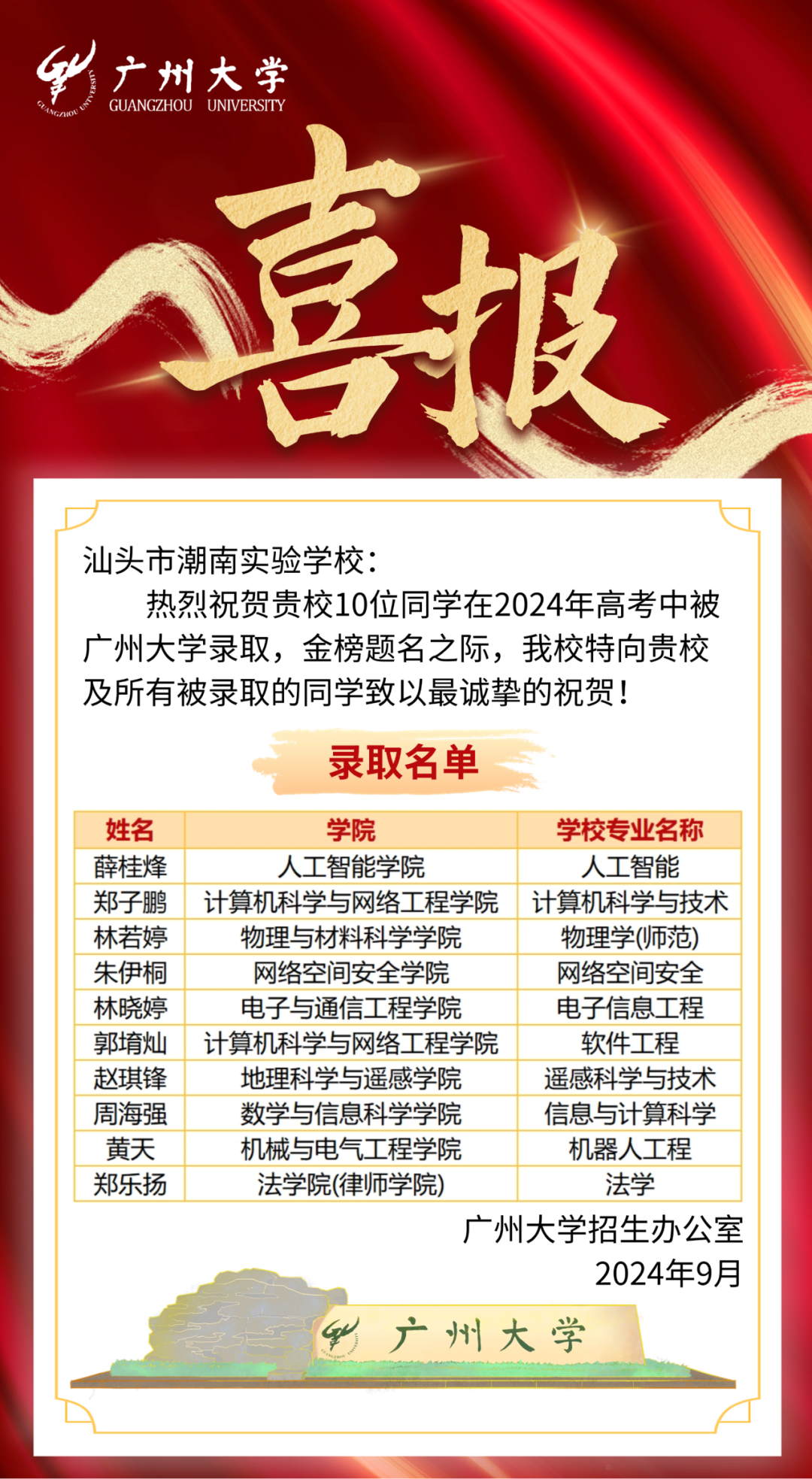 下面是2024年我校在汕头市录取详情(录取人数10人及以上,按人数排序),欢迎更多优秀学子加入广州大学,再次向这些生源中学致谢!祝贵校高考再创佳绩!