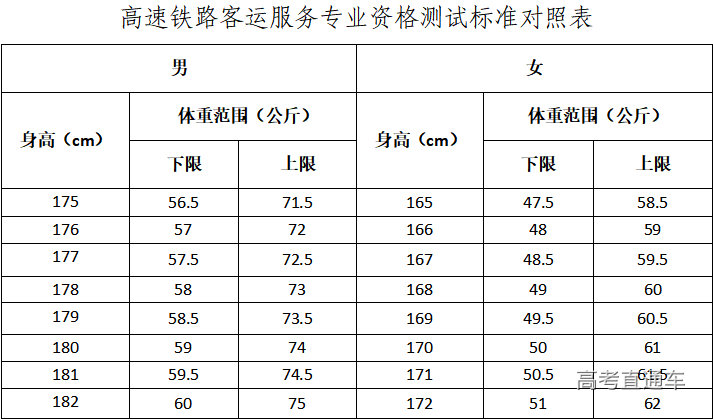 四.高速铁路客运服务专业资格测试(身高、体重、身高体重比例)必须达标。