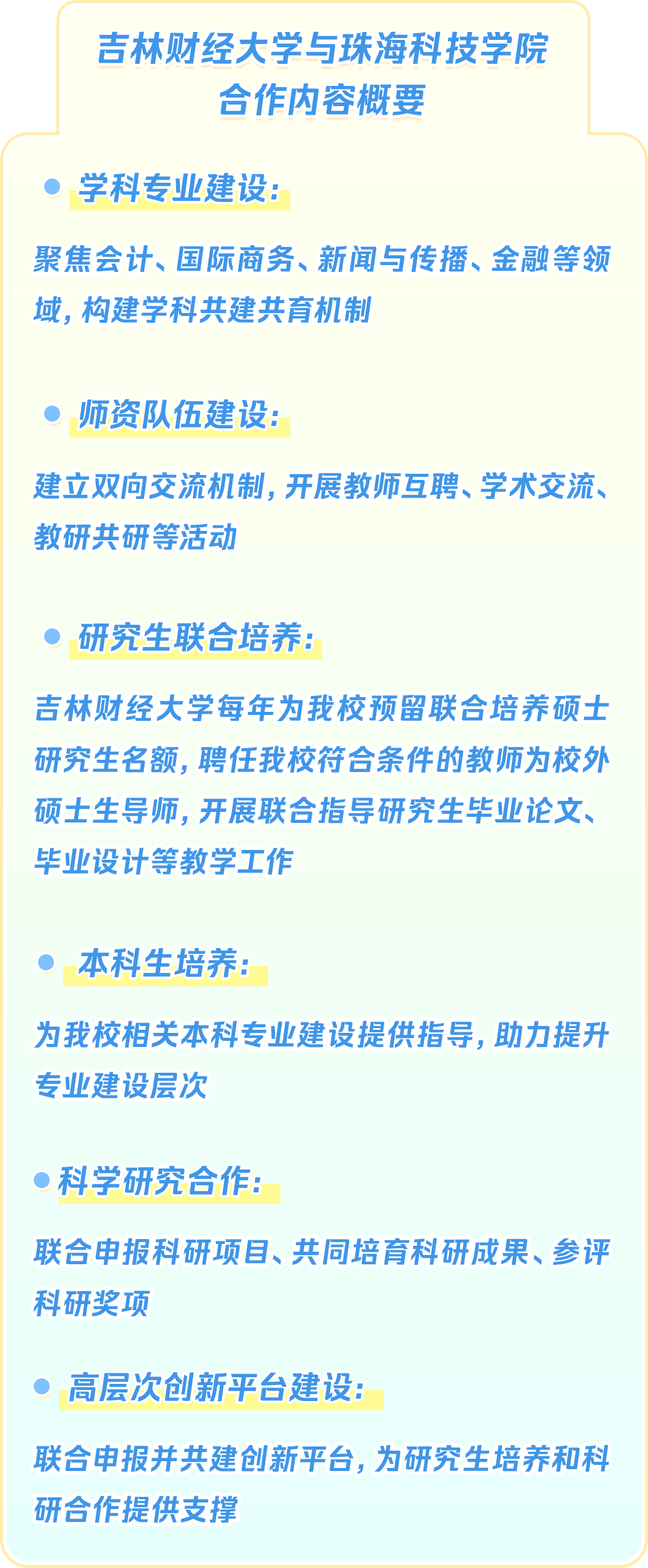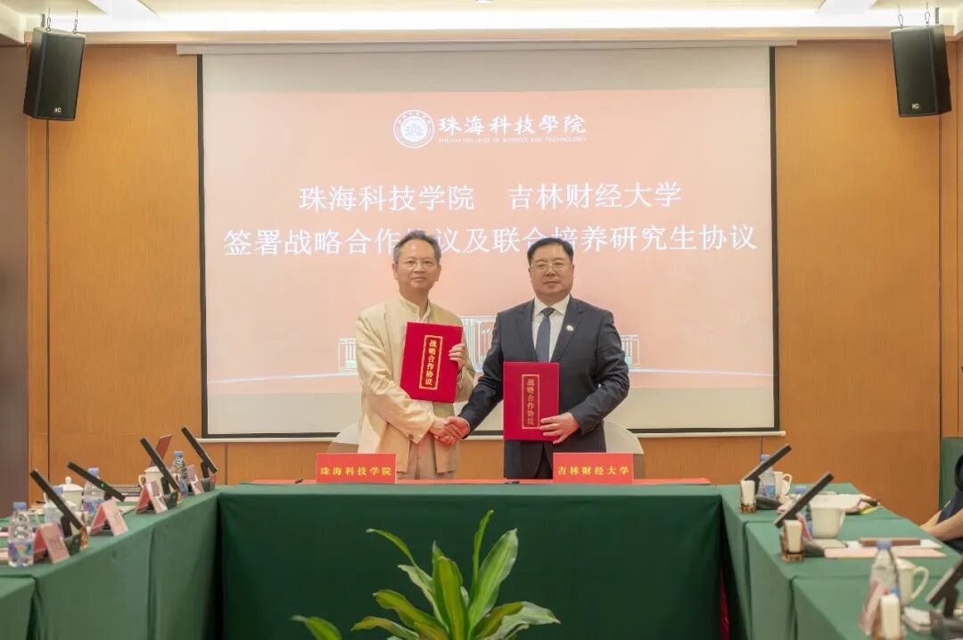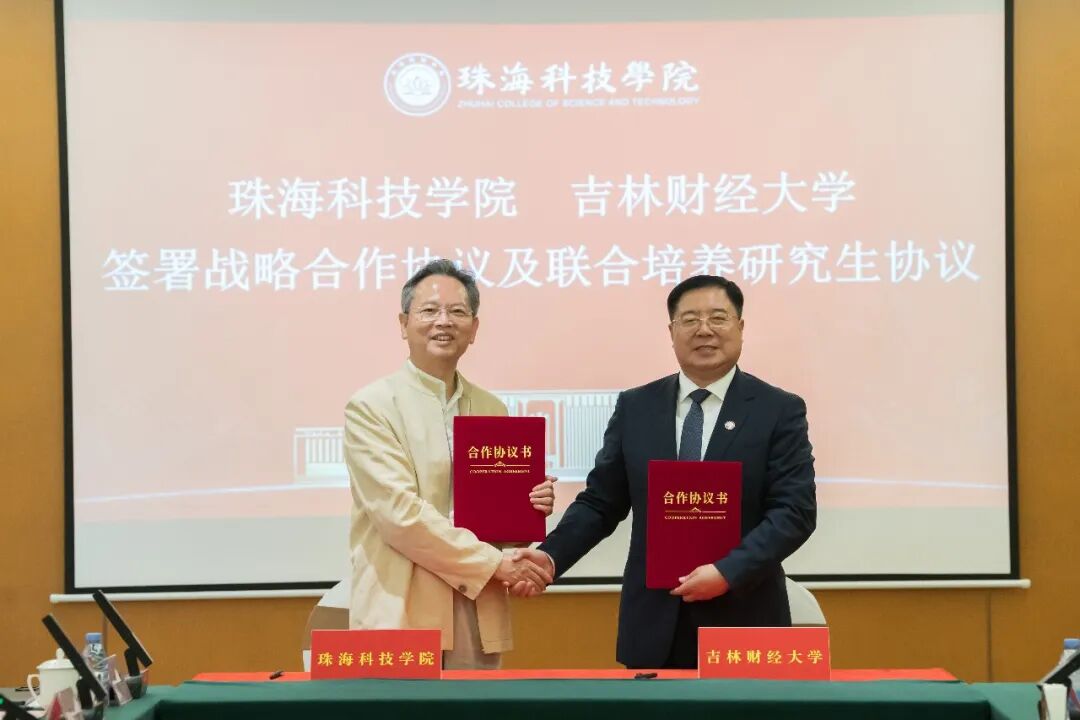 刘鸣在致辞中指出,珠海科技学院建校近22年来,坚持落实立德树人根本任务,办学成果丰硕,在研究生联合培养领域深耕十余年,积累了扎实的合作基础与丰富经验。吉林财经大学作为吉林省重点大学、我国财经教育领域知名高校、博士学位授予单位,学科优势显著、办学实力雄厚。此次签约合作以国家战略为引领、资源互补为路径,是服务吉林全面振兴与粤港澳大湾区建设、推动优质教育资源跨区域共享的关键举措,标志着两校开启全方位、深层次、长期性战略合作与人才共育的崭新篇章。未来,两校将秉持“优势互补、互利共赢、长期稳定、协同创新”原则,深化多领域合作,打造高水平校际合作标杆,为区域及国家高质量发展提供坚实人才支撑与智力保障。