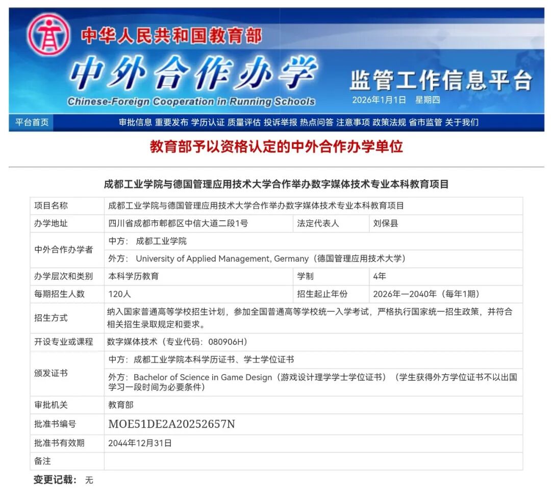 该项目采用 “4+0”模式(全程国内培养),每年招收120人。学生在修满人才培养方案规定的学分后可获中方数字媒体技术本科学历证书和学士学位证书,同时获得德方游戏设计学士学位证书。项目将深度融合中德两校优质教育资源,建立以产业需求为导向的国际化课程体系,实质性引进德方课程,配备国际化师资团队,精准对接成渝地区双城经济圈数字文化产业需求,服务四川省数字经济高质量发展,推动文化与科技产业协同发展,为四川省深入推进新型工业化与加快现代化产业体系建设发展培养具备国际视野、通晓国际规则和掌握专业技能的高素质应用型技术人才。