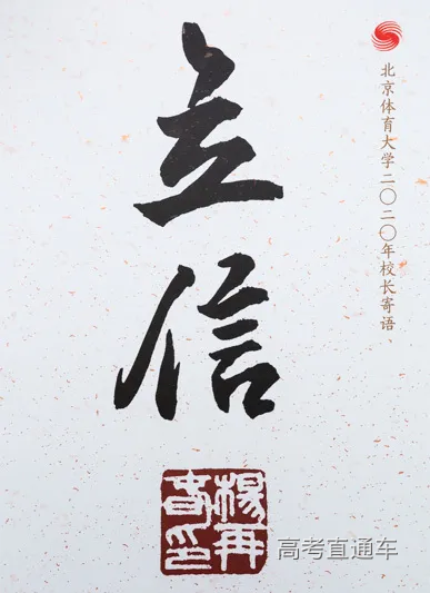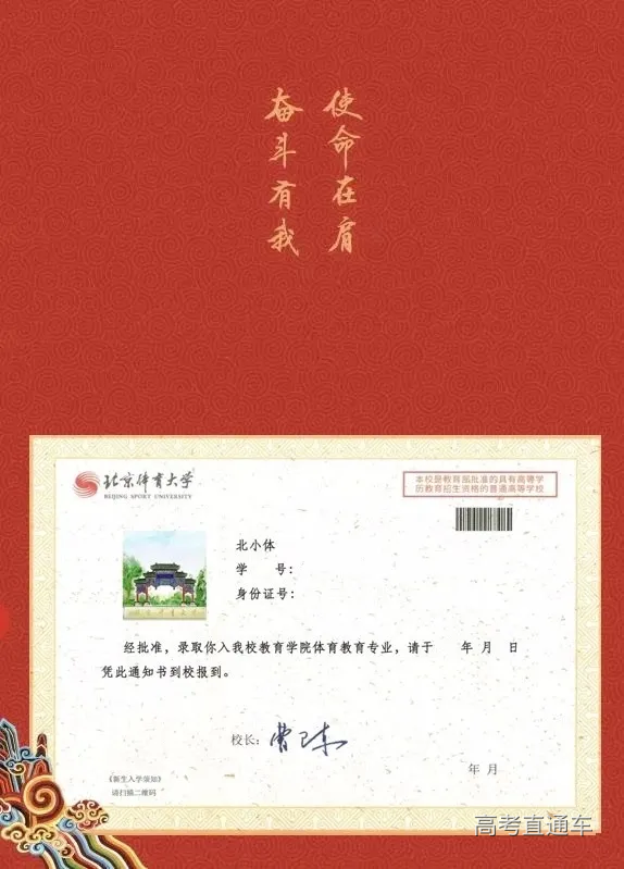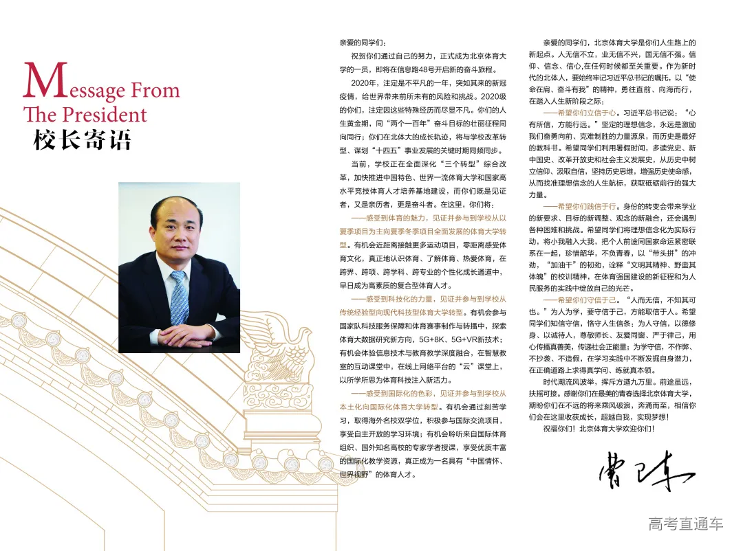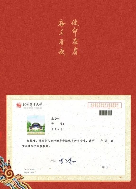 OUR STORIES 北京体育大学2020年度录取通知书 已经陆续寄出啦 欢迎2020级各位萌新 加入北体大家庭 当你收到这份录取通知书时 一段全新的旅程也将随之开启 愿你在这里 寻得心之所向 走过不悔青春 录取通知书的内页以祥云图案为底纹,上方书写的是习近平总书记在2019年6月18日给北京体育大学2016级研究生冠军班全体学生回信中勉励同学们的“使命在肩、奋斗有我”。 校长寄语 亲爱的同学们: 祝贺你们通过自己的努力,正式成为北京体育大学的一员,即将在信息路48号开启新的奋斗旅程。 2020年,注定是不平凡的一年,突如其来的新冠疫情,给世界带来前所未有的风险和挑战。2020级的你们,注定因这些特殊经历而尽显不凡。你们的人生黄金期,同“两个一百年”奋斗目标的壮丽征程同向同行;你们在北体大的成长轨迹,将与学校改革转型、谋划“十四五”事业发展的关键时期同频同步。 当前,学校正在全面深化“三个转型”综合改革,加快推进中国特色、世界一流体育大学和国家高水平竞技体育人才培养基地建设,而你们既是见证者,又是亲历者,更是奋斗者。在这里,你们将: ——感受到体育的魅力,见证并参与到学校从以夏季项目为主向夏季冬季项目全面发展的体育大学转型。有机会近距离接触更多运动项目,零距离感受体育文化,真正地认识体育、了解体育、热爱体育,在跨界、跨项、跨学科、跨专业的个性化成长通道中,早日成为高素质的复合型体育人才。 ——感受到科技化的力量,见证并参与到学校从传统经验型向现代科技型体育大学转型。有机会参与国家队科技服务保障和体育赛事制作与转播中,探索体育大数据研究新方向,5G+8K、5G+VR新技术;有机会体验信息技术与教育教学深度融合,在智慧教室的互动课堂中,在线上网络平台的“云”课堂上,以所学所思为体育科技注入新活力。 ——感受到国际化的色彩,见证并参与到学校从本土化向国际化体育大学转型。有机会通过刻苦学习,取得海外名校双学位,积极参与国际交流项目,享受自主开放的学习环境;有机会聆听来自国际体育组织、国外知名高校的专家学者授课,享受优质丰富的国际化教学资源,真正成为一名具有“中国情怀、世界视野”的体育人才。 亲爱的同学们,北京体育大学是你们人生路上的新起点。人无信不立,业无信不兴,国无信不强。信仰、信念、信心,在任何时候都至关重要。作为新时代的北体人,要始终牢记习近平总书记的嘱托,以“使命在肩、奋斗有我”的精神,勇往直前、向海而行,在踏入人生新阶段之际: ——希望你们立信于心。习近平总书记说:“心有所信,方能行远。” 坚定的理想信念,永远是激励我们奋勇向前、克难制胜的力量源泉,而历史是最好的教科书。希望同学们利用暑假时间,多读党史、新中国史、改革开放史和社会主义发展史,从历史中树立信仰、汲取自信,坚持历史思维,增强历史使命感,从而找准理想信念的人生航标,获取砥砺前行的强大力量。 ——希望你们践信于行。身份的转变会带来学业的新要求、目标的新调整、观念的新融合,还会遇到各种困难和挑战。希望同学们将理想信念化为实际行动,将小我融入大我,把个人前途同国家命运紧密联系在一起,珍惜韶华,不负青春,以“带头拼”的冲劲,“加油干”的韧劲,诠释“文明其精神、野蛮其体魄”的校训精神,在体育强国建设的新征程和为人民服务的实践中绽放自己的光芒。 ——希望你们守信于己。“人而无信,不知其可也。”