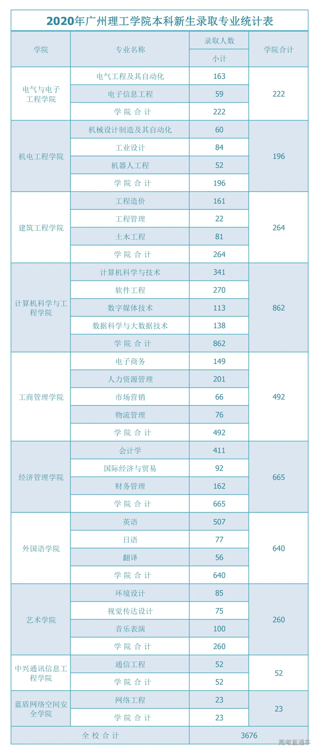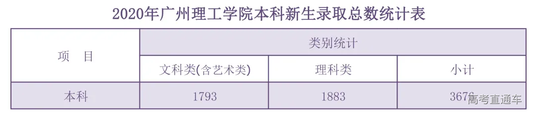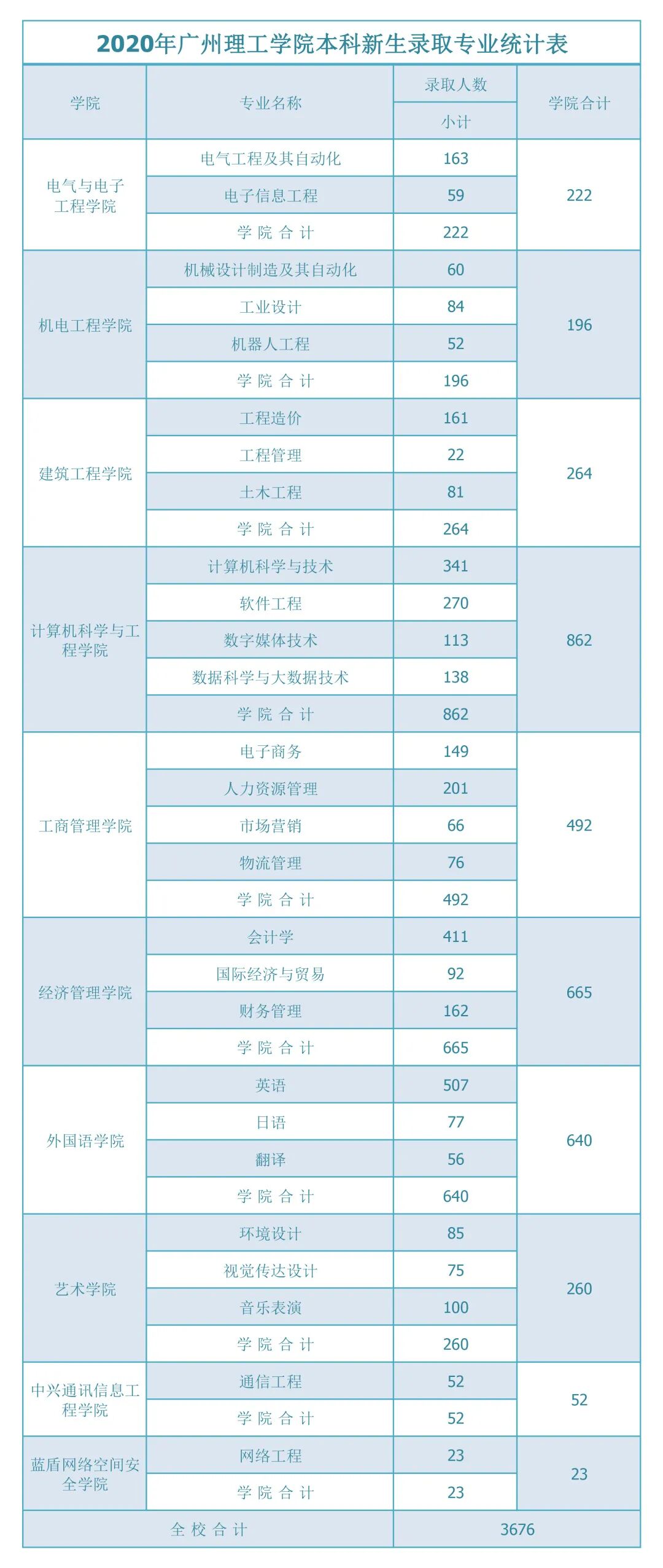 广州理工学院 (原广东技术师范大学天河学院) 2020年本科招生情况 招生情况 8月14日,广东省2020年普通高校本科招生录取投档。 8月20日,我校顺利完成2020年普通高校招生网上录取和审核工作,共录取3676人。其中文科类1533人、理科类1883人、美术类160人、音乐类100人。 从投档情况来看,我校生源质量高。计算机类专业、英语、会计学、电子商务、人力资源管理等热门专业深受考生青睐。 录取情况 &