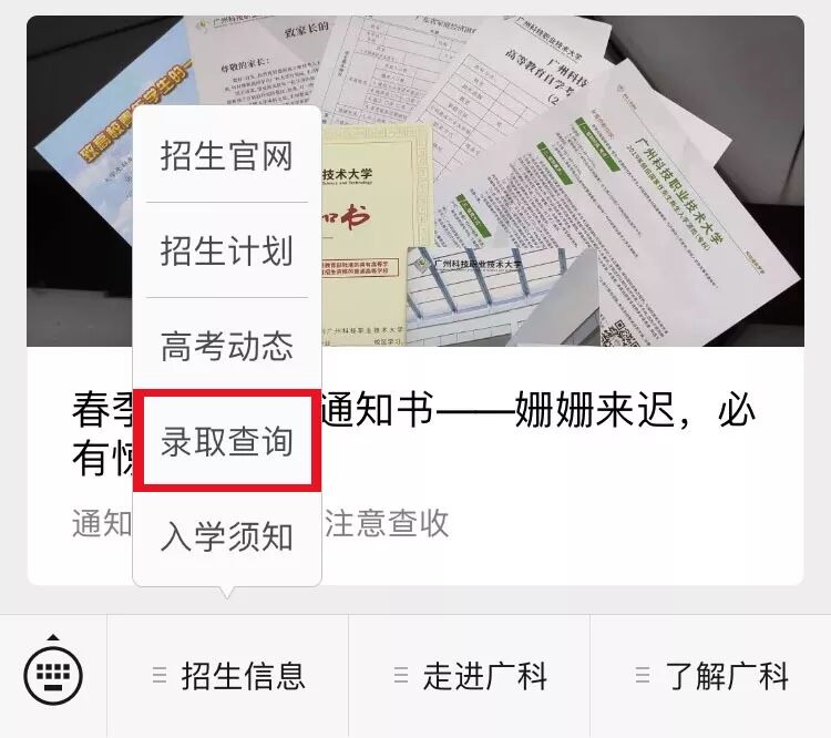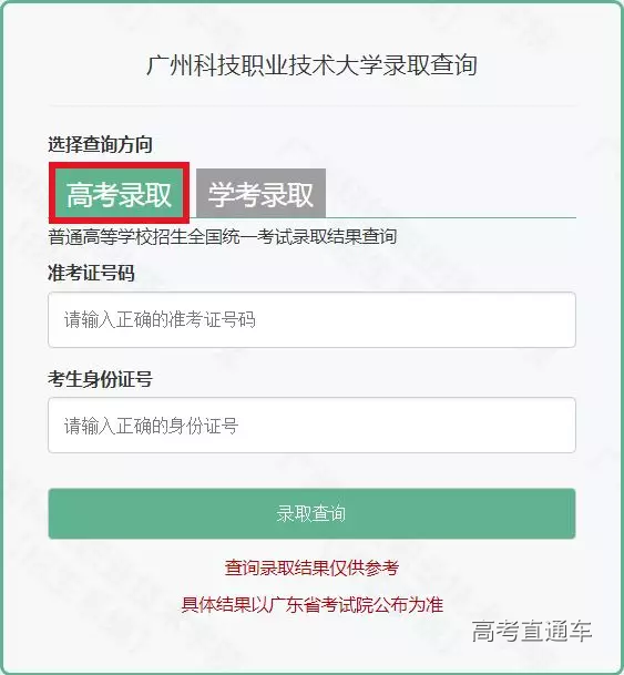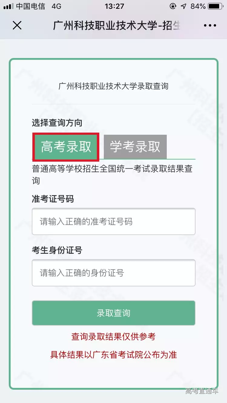 (一)关注广东省教育考试院官微,在页面底部选择“小程序”栏,点击进入录取查询界面,通过考生号和密码登录即可查询录取结果(仅公布录取院校)。省教育考试院每天16:00更新当天12:00前完成录取审核的考生数据。