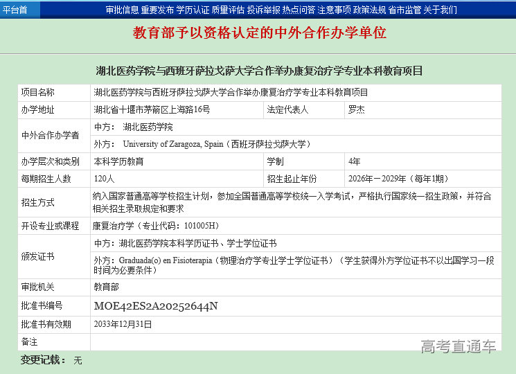 我校康复治疗学专业是国家中管局中医康复学重点学科、省级一流专业,该项目旨在通过引进萨拉戈萨大学先进的教育思想、办学理念、管理经验和人才培养模式,加强康复人才培养模式改革和创新。项目采用“4+0”培养模式,学生4学年均在我校完成学业,在达到双方毕业和学位授予条件后,同时授予两校学位,获得外方学位证书不以出国学习一段时间为必要条件。该项目从2026年开始纳入国家普通高等教育本科招生计划。
