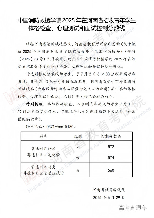 中国消防救援学院2025年在河南省招收青年学生体格检查、心理测试和面试控制分数线