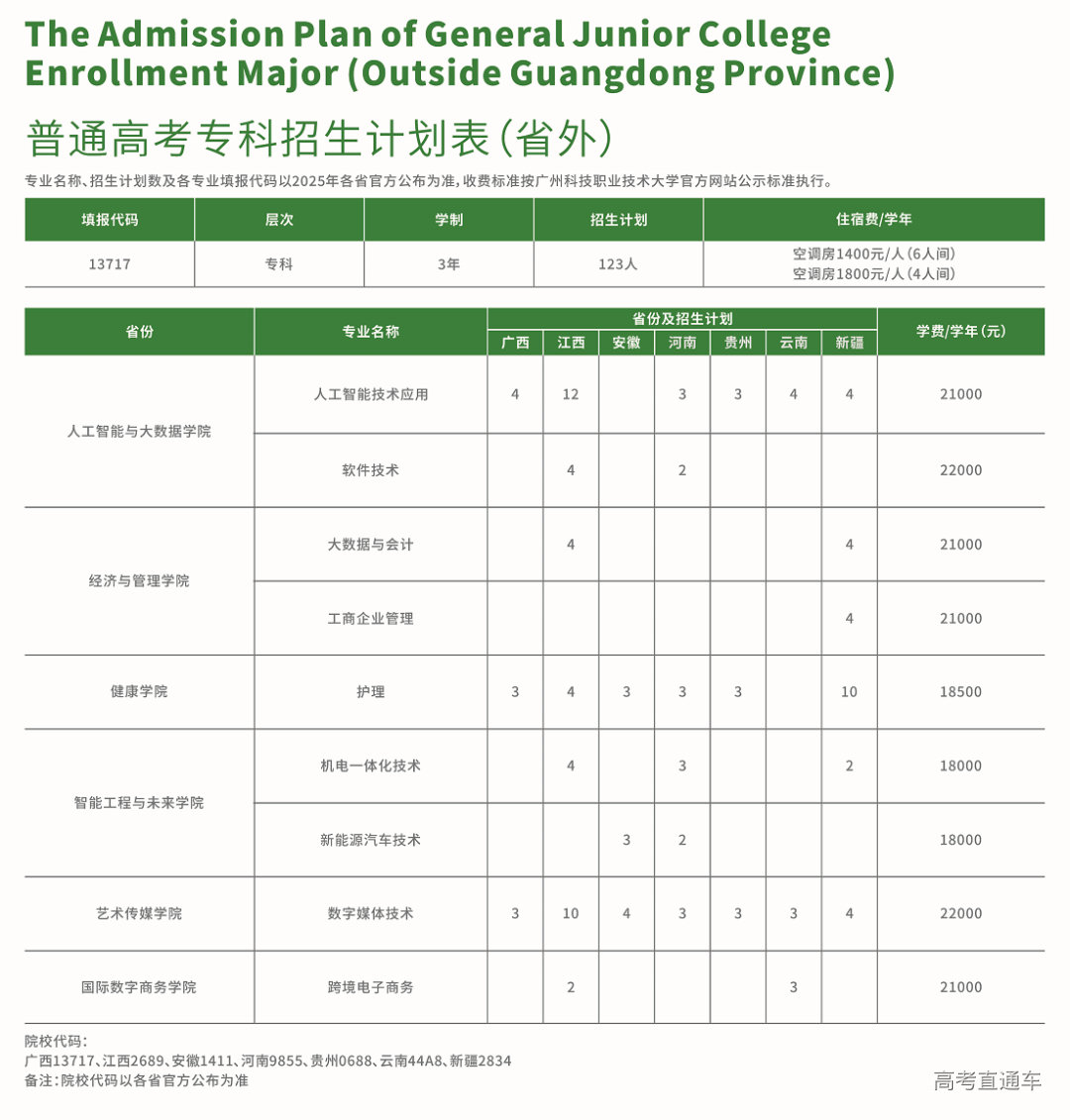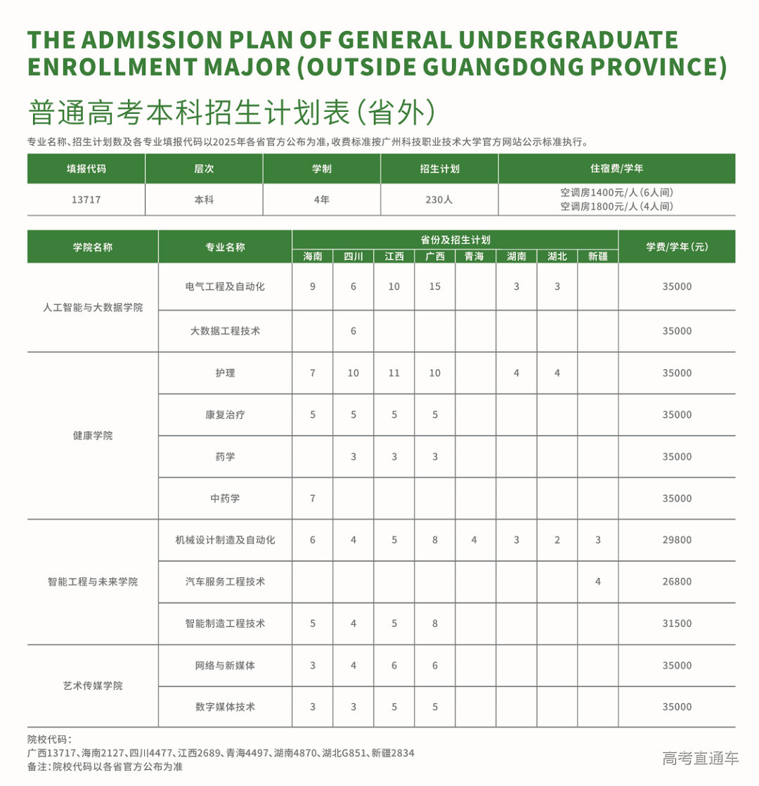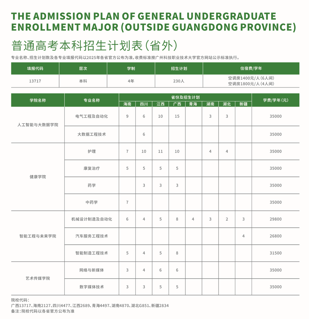 广州科技职业技术大学 2025年夏季高考招生计划 正式官宣 近日,教育部和广东省教育厅下达广州科技职业技术大学2025年本科招生计划4000人,专科招生计划1000人。 夏季普通高考本科招生计划:广东省招生计划3430人,省外招生计划230人,招生省份面向广东、海南、四川、江西、广西、青海、湖南、湖北、新疆共9个省(自治区);夏季普通高考专科招生计划:广东省招生计划77人,省外招生计划123人,招生省份面向广东、广西、江西、安徽、河南、贵州、云南、新疆共8个省(自治区)。 点击图片查看详情 广州科技职业技术大学 填报代码:13717 广州科技职业技术大学 承载梦想和希望 在这里 接受优质的教育 掌握扎实的专业知识和技能 培养良好的综合素质 广科大,欢迎你 选择广科大的七大理由 优势一 广州唯一,国家首批 广州市唯一一所全国首批本科层次职业教育试点学校,这意味着我们站在国家职业教育改革的前沿,以前瞻性的教育理念、深度融合产业的教学模式,为学生铺就一条成才通道。在这里,你将获得国家认可的本科学历与行业亟需的前沿技能! 优势二 专业集群,多科融通,未来可期 学校形成以工为主,经、管、文、艺、大健康等多学科协调发展的专业体系,这不是简单的学科叠加,而是构建了多学科深度交叉融合、协同发展的现代专业集群。无论你的兴趣在智能制造、数字经济、创意设计还是健康服务,广科大都为你提供广阔且前沿的选择空间,精准对接未来产业需求! 优势三 产教融合,真岗实练,就业有“路” 学校与众多优质企业、行业协会建立了深度合作关系,共建产业学院、校外就业实习实训实践教学基地。课程融入海量真实项目案例,学习即实战!“产学研相结合,教学做一体化” 的培养模式,让学生在毕业前就积累丰富的实践经验,手握通往名企的“金钥匙”,毕业即就业,起点更高! 优势四 多彩校园,青春绽放,全面成长 47个学生社团涵盖文化艺术、体育竞技、公益志愿等方方面面。高水平的文体竞赛、前沿的学术讲座、丰富的实践活动贯穿全年。这里是激发潜能、展示才华、结交挚友、锻造领导力的绝佳舞台,让你的大学生活充实、精彩、不留遗憾! 优势五 设施完善,舒适现代,生活无忧 学校图书馆藏书丰富,无线网络覆盖全校,实行不间断开放服务和网络信息服务,为学生提供了良好的学习资源。校园内配备了咖啡店、奶茶店、大剧院、驾校、健身房、24小时自助银行等便利设施,足不出校就能满足生活所需。学生公寓设施齐全,配备了空调、洗衣机、独立卫生间、淋浴室等设备,让学生在舒适的环境中学习和生活。学校饭堂装潢高雅,饭菜美味可口多种多样,让学生寻觅他乡美食的同时,也能找到家乡的味道。 优势六 奖助齐全,助学无忧 奖助政策齐全,帮助学子们解决后顾之忧,专心学业,勇攀学术高峰。无论是国家奖学金、励志奖学金、国家助学金,还是学校奖学金、学校助学金、勤工俭学岗位,都为学生提供支持。2024年全校共有7337名学生获得不同等级的奖学金,占在校生人数的38%。其中,获得国家奖学金、景大奖学金共34名,国家励志奖学金608名,占获奖人数的8.8%,其他奖项奖学金6695名,占获奖人数的91.2%。 优势七 交通便利,区位优越,机遇无限 学校交通便利,广州校区位于白云区钟落潭高校园区,校门口步行可达广州地铁14号线新和站。滨海校区位于茂名市电白区高地智慧城,毗邻中国第一滩,校园环境优美,课余时间尽享海景。在广科大求学,意味着你不仅能享受优质的校园资源,更能无缝对接大湾区最前沿的产业动态、最丰富的实习机会、最广阔的发展平台。