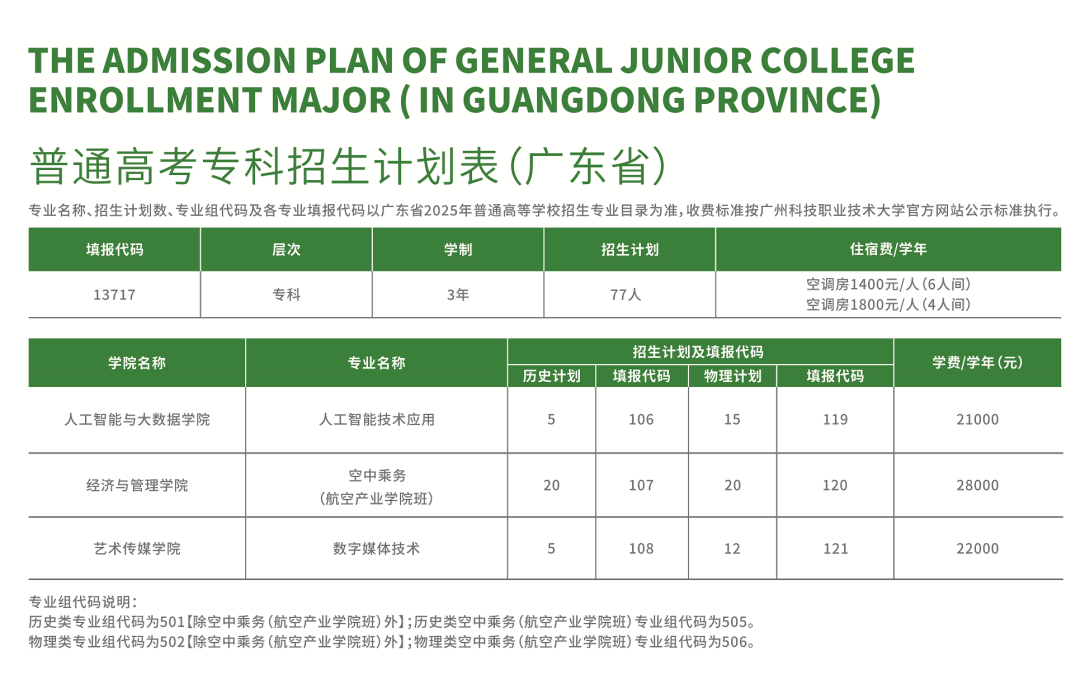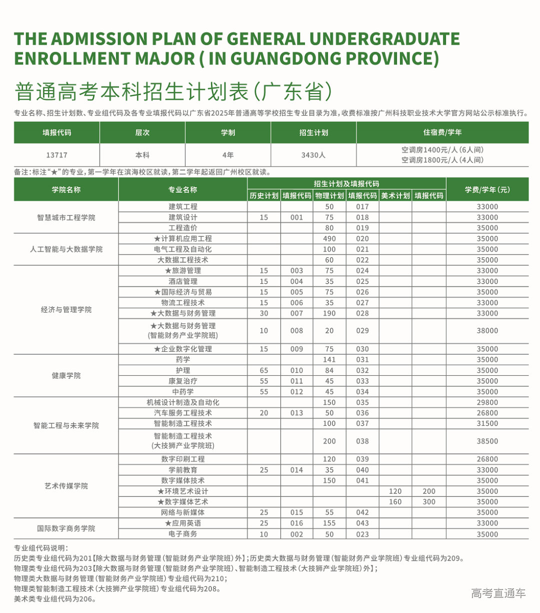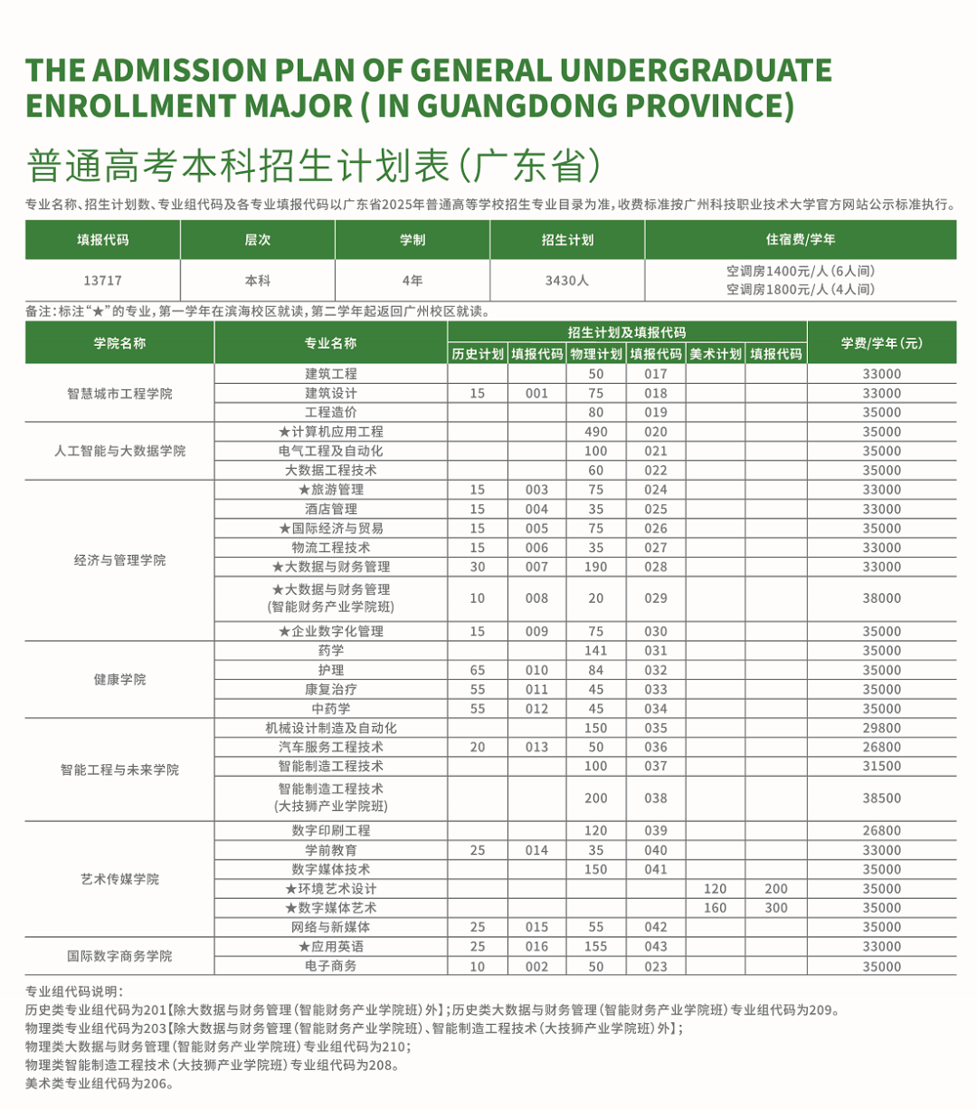 广州科技职业技术大学 2025年夏季高考招生计划 正式官宣 近日,教育部和广东省教育厅下达广州科技职业技术大学2025年本科招生计划4000人,专科招生计划1000人。 夏季普通高考本科招生计划:广东省招生计划3430人,省外招生计划230人,招生省份面向广东、海南、四川、江西、广西、青海、湖南、湖北、新疆共9个省(自治区);夏季普通高考专科招生计划:广东省招生计划77人,省外招生计划123人,招生省份面向广东、广西、江西、安徽、河南、贵州、云南、新疆共8个省(自治区)。 点击图片查看详情 广州科技职业技术大学 填报代码:13717 广州科技职业技术大学 承载梦想和希望 在这里 接受优质的教育 掌握扎实的专业知识和技能 培养良好的综合素质 广科大,欢迎你 选择广科大的七大理由 优势一 广州唯一,国家首批 广州市唯一一所全国首批本科层次职业教育试点学校,这意味着我们站在国家职业教育改革的前沿,以前瞻性的教育理念、深度融合产业的教学模式,为学生铺就一条成才通道。在这里,你将获得国家认可的本科学历与行业亟需的前沿技能! 优势二 专业集群,多科融通,未来可期 学校形成以工为主,经、管、文、艺、大健康等多学科协调发展的专业体系,这不是简单的学科叠加,而是构建了多学科深度交叉融合、协同发展的现代专业集群。无论你的兴趣在智能制造、数字经济、创意设计还是健康服务,广科大都为你提供广阔且前沿的选择空间,精准对接未来产业需求! 优势三 产教融合,真岗实练,就业有“路” 学校与众多优质企业、行业协会建立了深度合作关系,共建产业学院、校外就业实习实训实践教学基地。课程融入海量真实项目案例,学习即实战!“产学研相结合,教学做一体化” 的培养模式,让学生在毕业前就积累丰富的实践经验,手握通往名企的“金钥匙”,毕业即就业,起点更高! 优势四 多彩校园,青春绽放,全面成长 47个学生社团涵盖文化艺术、体育竞技、公益志愿等方方面面。高水平的文体竞赛、前沿的学术讲座、丰富的实践活动贯穿全年。这里是激发潜能、展示才华、结交挚友、锻造领导力的绝佳舞台,让你的大学生活充实、精彩、不留遗憾! 优势五 设施完善,舒适现代,生活无忧 学校图书馆藏书丰富,无线网络覆盖全校,实行不间断开放服务和网络信息服务,为学生提供了良好的学习资源。校园内配备了咖啡店、奶茶店、大剧院、驾校、健身房、24小时自助银行等便利设施,足不出校就能满足生活所需。学生公寓设施齐全,配备了空调、洗衣机、独立卫生间、淋浴室等设备,让学生在舒适的环境中学习和生活。学校饭堂装潢高雅,饭菜美味可口多种多样,让学生寻觅他乡美食的同时,也能找到家乡的味道。 优势六 奖助齐全,助学无忧 奖助政策齐全,帮助学子们解决后顾之忧,专心学业,勇攀学术高峰。无论是国家奖学金、励志奖学金、国家助学金,还是学校奖学金、学校助学金、勤工俭学岗位,都为学生提供支持。2024年全校共有7337名学生获得不同等级的奖学金,占在校生人数的38%。其中,获得国家奖学金、景大奖学金共34名,国家励志奖学金608名,占获奖人数的8.8%,其他奖项奖学金6695名,占获奖人数的91.2%。 优势七 交通便利,区位优越,机遇无限 学校交通便利,广州校区位于白云区钟落潭高校园区,校门口步行可达广州地铁14号线新和站。滨海校区位于茂名市电白区高地智慧城,毗邻中国第一滩,校园环境优美,课余时间尽享海景。在广科大求学,意味着你不仅能享受优质的校园资源,更能无缝对接大湾区最前沿的产业动态、最丰富的实习机会、最广阔的发展平台。