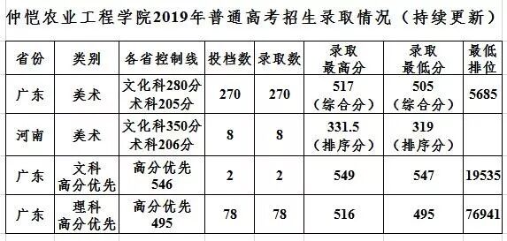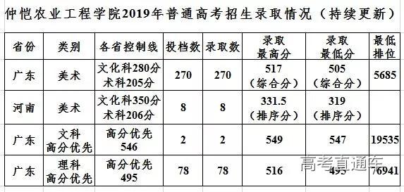 仲恺农业工程学院文科高分优先投档2人,录取2人,最低排位19535;理科高分优先投档78人,录取78人,最低排位76941。