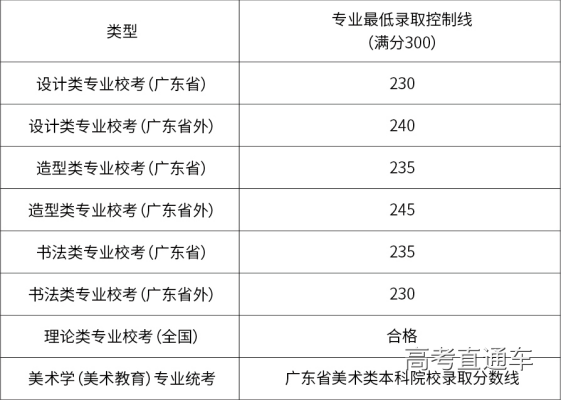 2、各美术类专业的专业最低录取控制线详见如下: