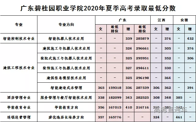 超省本科线:39分 最低投档分:324分 超省控线:164分 最低排位:296661 恭喜过线的朋友们~另外超过本科线被我校录取的考生,将获得一万元奖励! 广东碧桂园职业学院在广东省的录取一次性满档,没有补录,截至碧碧发文前,江西和安徽的录取结果也已出炉。